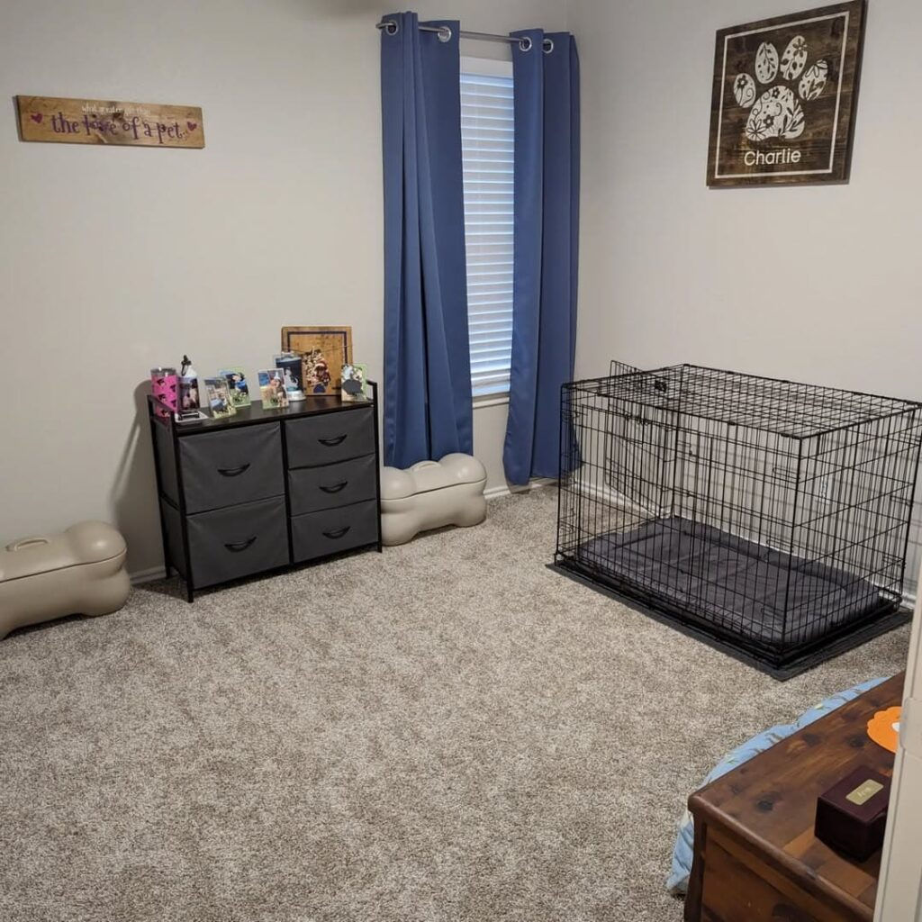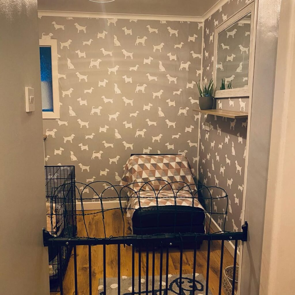 For dogs who enjoy the security of a crate, you can make it a stylish and comfortable space. Place the crate in a small nook and make it inviting with soft blankets and pillows. Add decorative elements like removable paw-print wallpaper or a small shelf with a plant above the crate for a polished look.