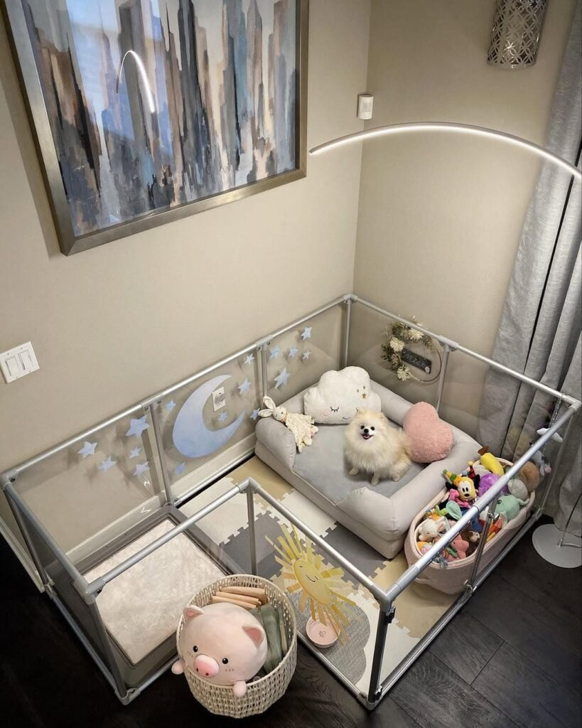 For playful dogs who love activity and relaxation alike, combining a play area with a nap corner works perfectly. A soft rug provides a comfortable surface, while a baby gate keeps the area safe. Plush toys encourage play, and a cozy bed lets your dog rest when it’s time to recharge.