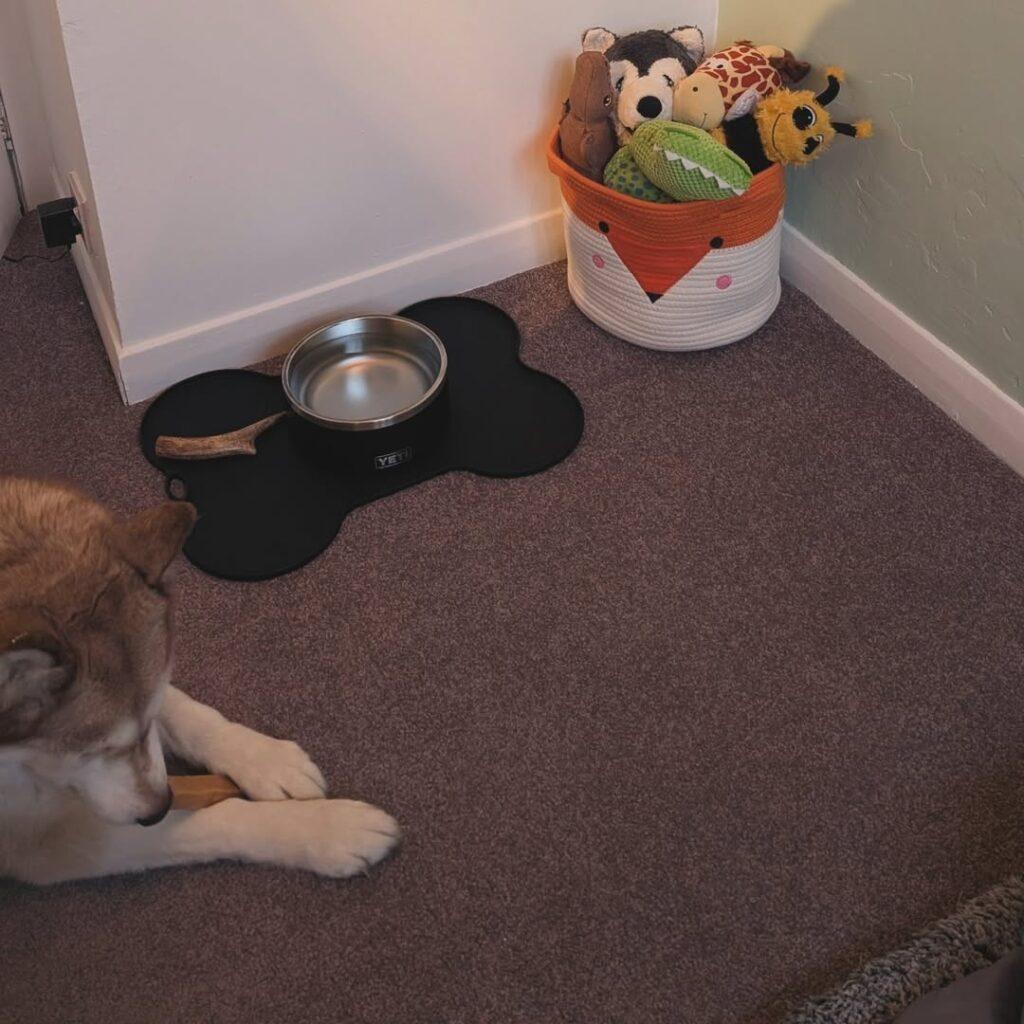 Thoughtful touches like non-slip rugs, calming lighting, and accessible food and water stations make the space inviting and practical. You can also incorporate storage for toys, treats, and grooming essentials to keep the area tidy.