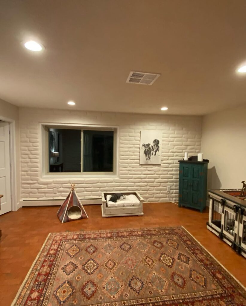 A rustic look combined with cozy comfort creates a charming dog corner. A brick or textured wall adds character, while a soft bed or mat keeps your dog comfortable. Small framed prints or artwork can elevate the style without overwhelming the space.