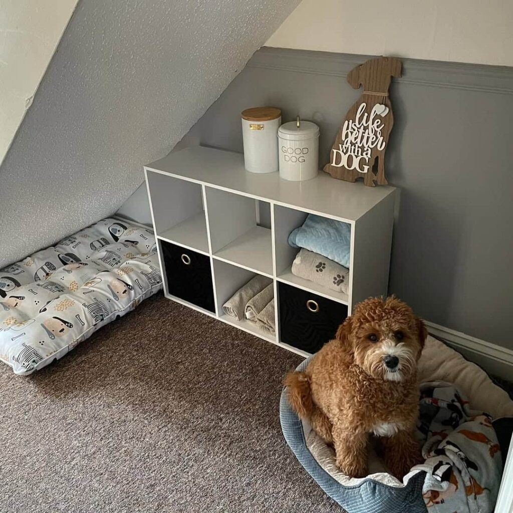 Dogs love organized spaces that mix play and rest. A small shelf or cube storage system can hold toys and treats, while a cushioned bed nearby provides a comfortable resting area. This combination keeps everything tidy and accessible.