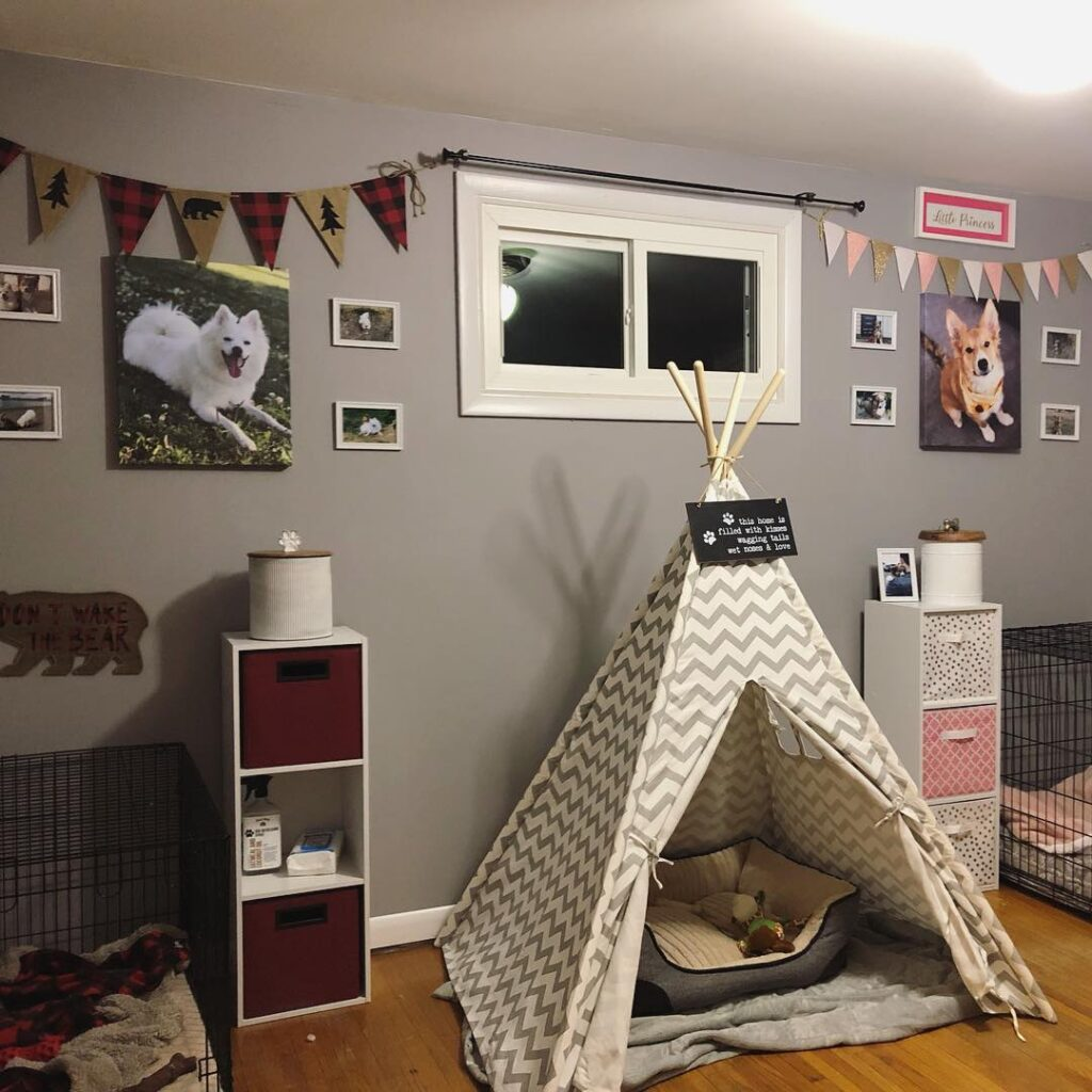 Dogs often enjoy a small, private hideout, and a teepee-style setup provides exactly that. Layered blankets or a plush bed inside create comfort, while nearby framed portraits and subtle decorations make it visually charming.