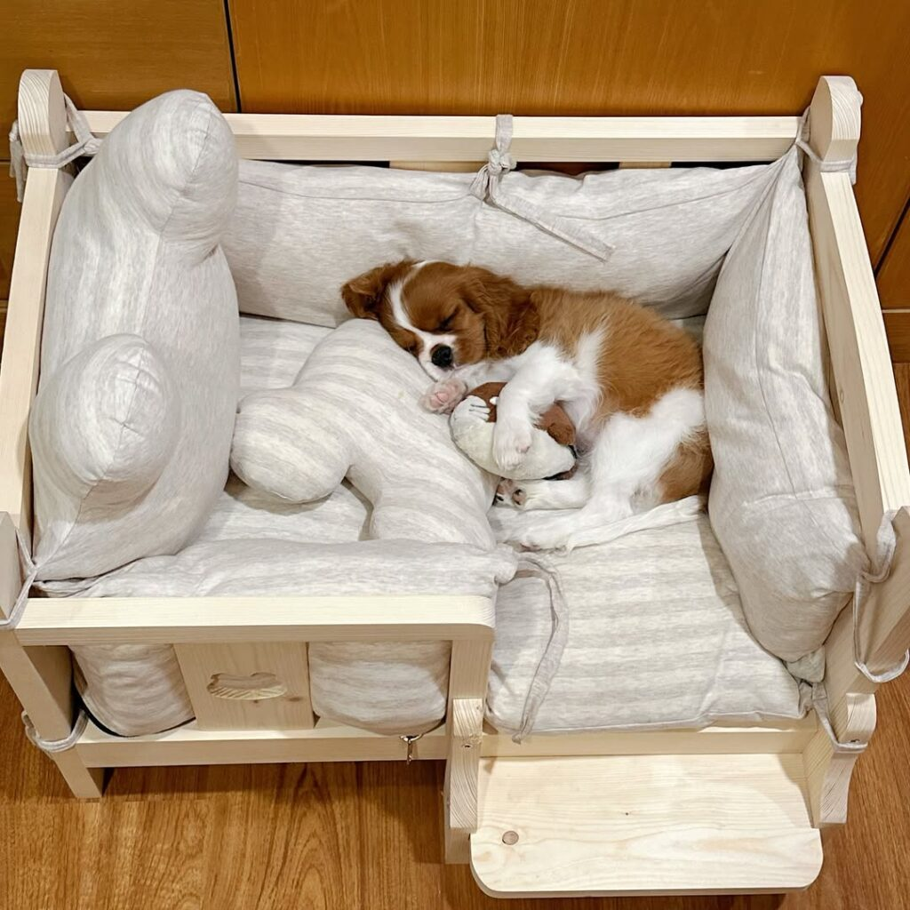 To replicate this, use a small toddler bed or wooden frame, add soft cushions and a cozy blanket. This setup ensures your dog naps comfortably while keeping your living space looking chic and inviting.