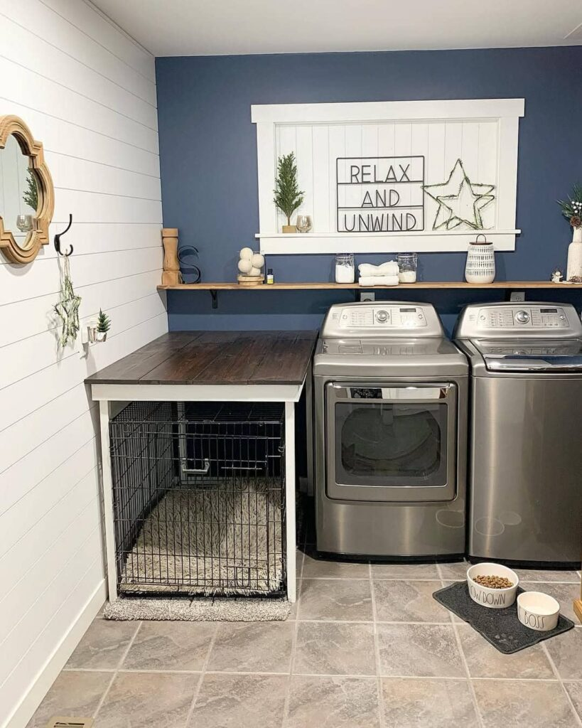 Even a small corner near cabinets or a laundry area can become a stylish dog den. Utilize lower cabinets to conceal a bed and position bowls underneath for convenience. Darker wall colors and simple artwork make the space both functional and visually appealing.
