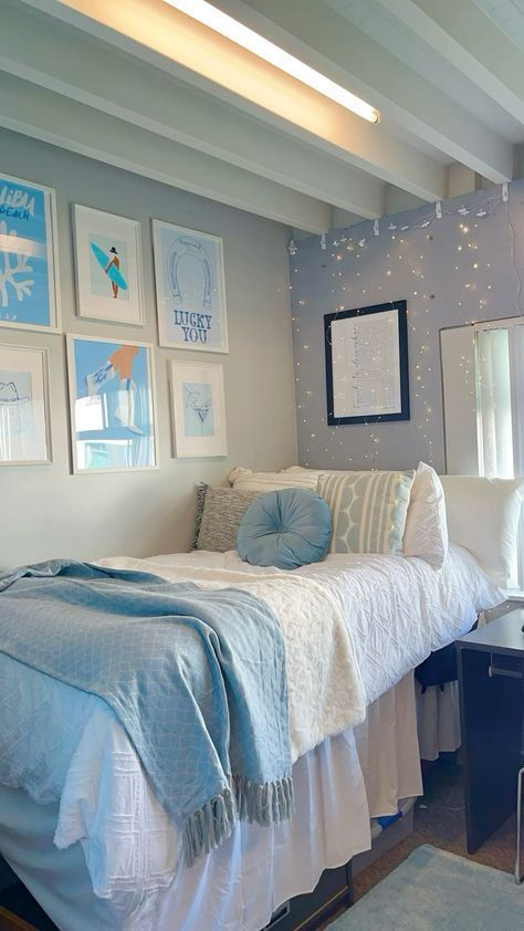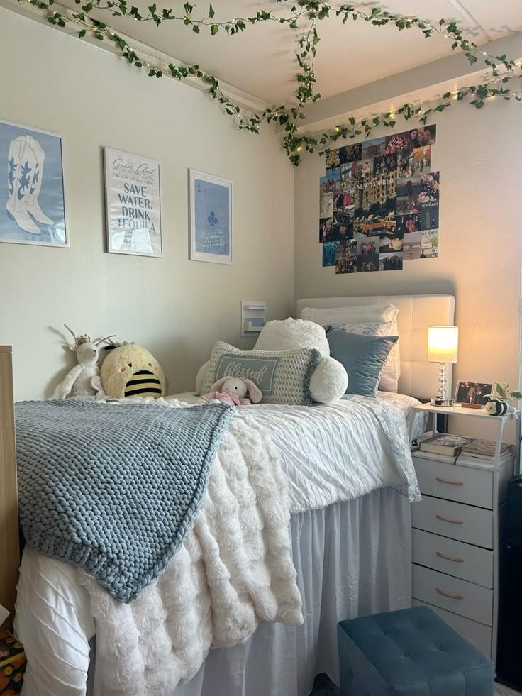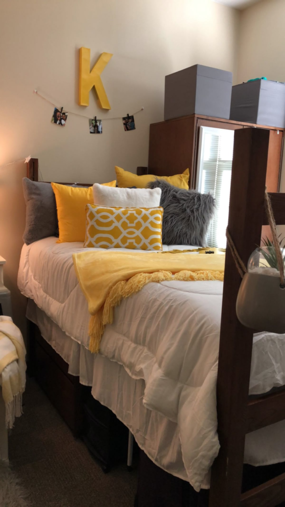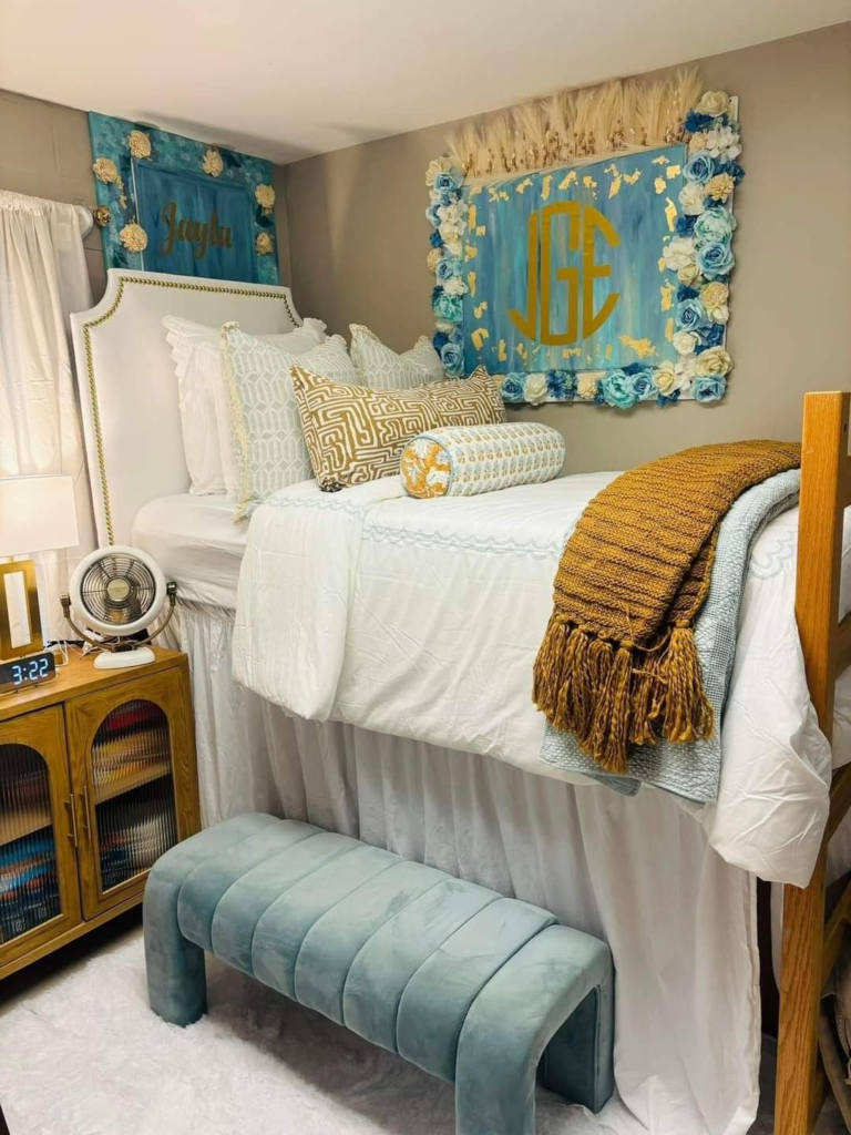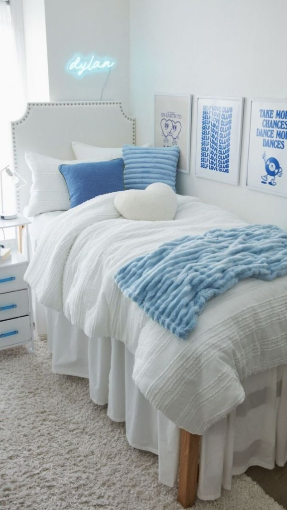 Simple and timeless, beige and white offer a clean foundation that’s easy to personalize. Beige bedding with white sheets and walls gives your dorm a polished yet cozy feel.