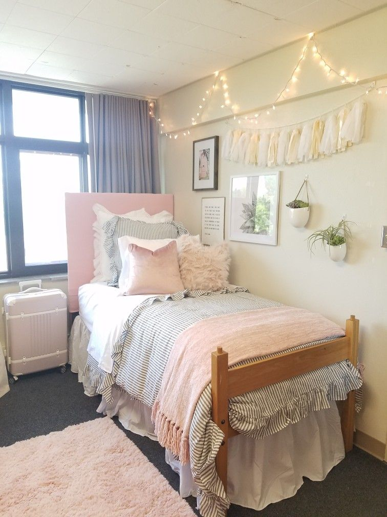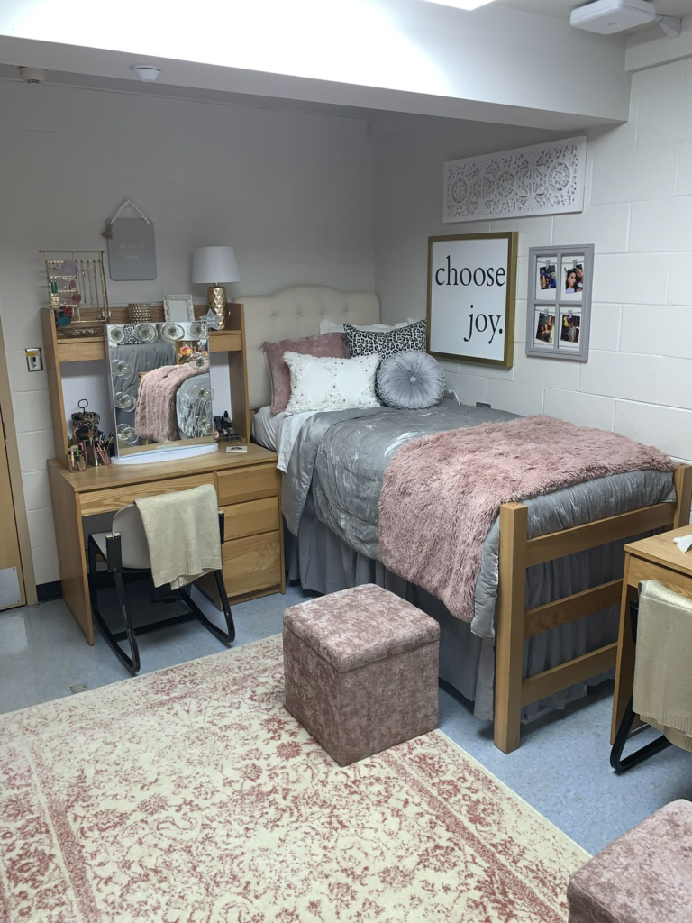 This gentle, feminine pairing feels both cozy and refined. Blush pink adds warmth and softness, while grey keeps the look balanced and sophisticated. Try pink bedding layered with grey throws and subtle metallic accents for an elegant dorm setup.