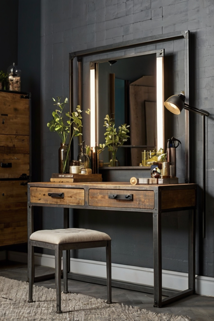 If you’re drawn to bold, urban style, an industrial dressing table offers a striking mix of metal and wood. Think sturdy steel frames, visible screws or bolts, and dark stained surfaces that create a rugged yet stylish look.