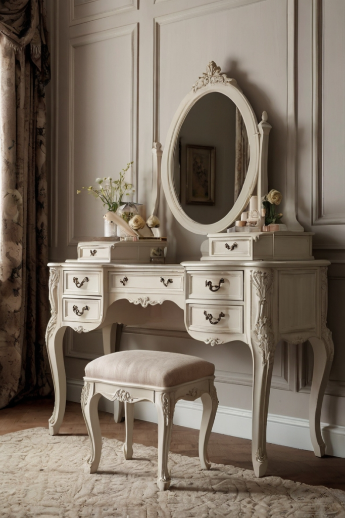 Channel old Hollywood elegance with a dressing table that looks like it belongs in a classic film. This style embraces ornate details, curved legs, and a large, dramatic mirror that instantly brings a sense of luxury.