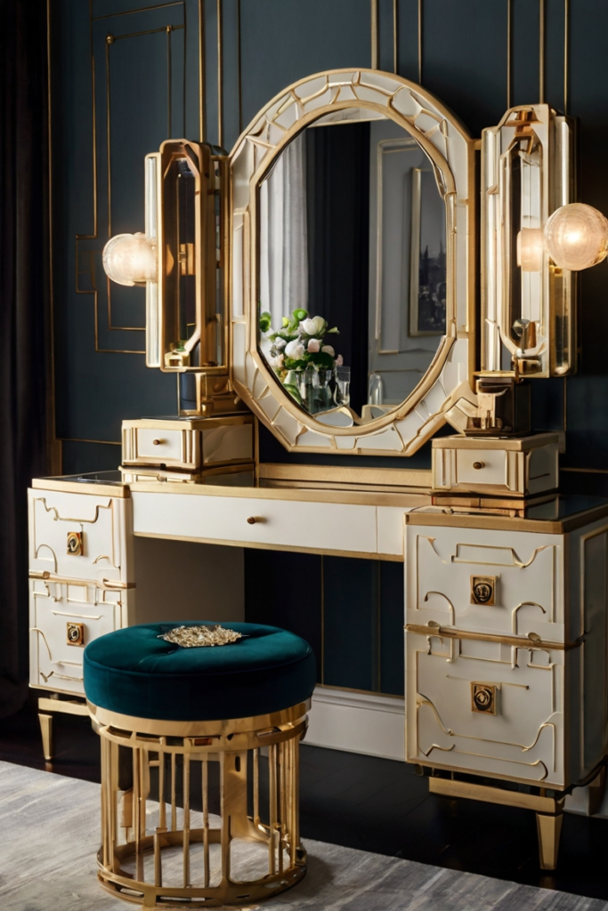 For lovers of bold geometry and dramatic flair, an Art Deco dressing table delivers a true statement. Expect structured lines, metallic accents—often gold—and reflective materials that echo the glamour of the 1920s.