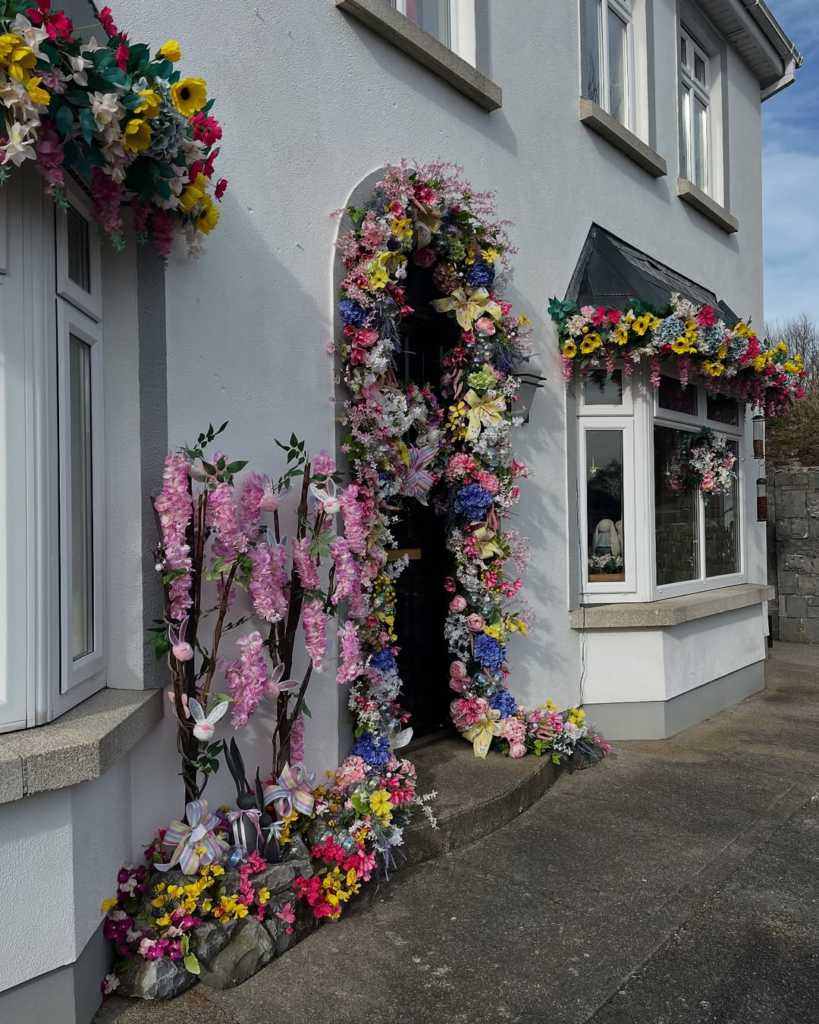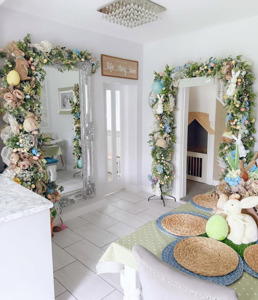 This doorway invites the holiday celebration indoors. Pastel florals, trailing ribbons, and Easter eggs combine with an open door to give a glimpse of the cozy interior beyond. A mossy bunny on the floor adds charm without cluttering the space. The effect is light, welcoming, and imaginative, merging seasonal decoration with everyday living in a way that feels effortless and natural.