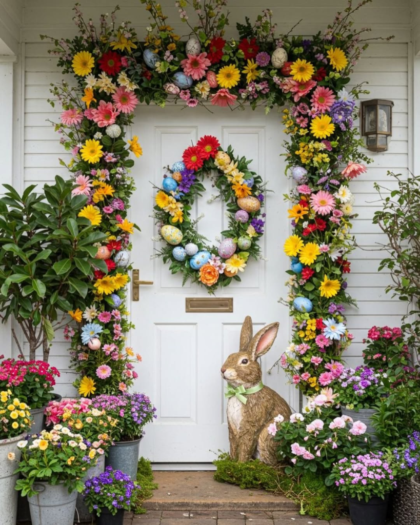 Bright, bold, and structured, this doorway captures the energy of a grand Easter parade. Daisy garlands wrap the frame, and the egg-adorned wreath introduces a whimsical nod to tradition. An oversized bunny statue completes the setup, greeting visitors with charm and humor. Every detail—flower, egg, and playful accent—feels intentional, creating a festive moment that’s both joyful and balanced.
