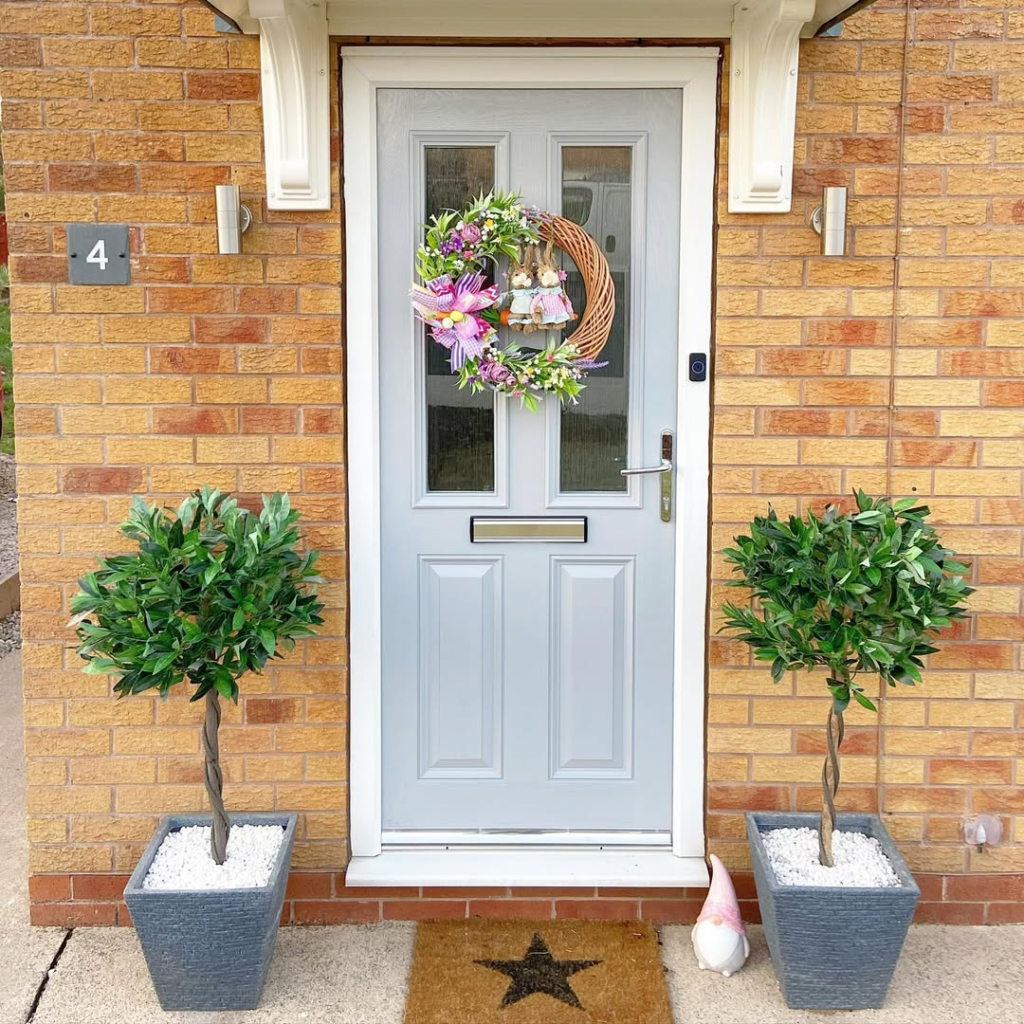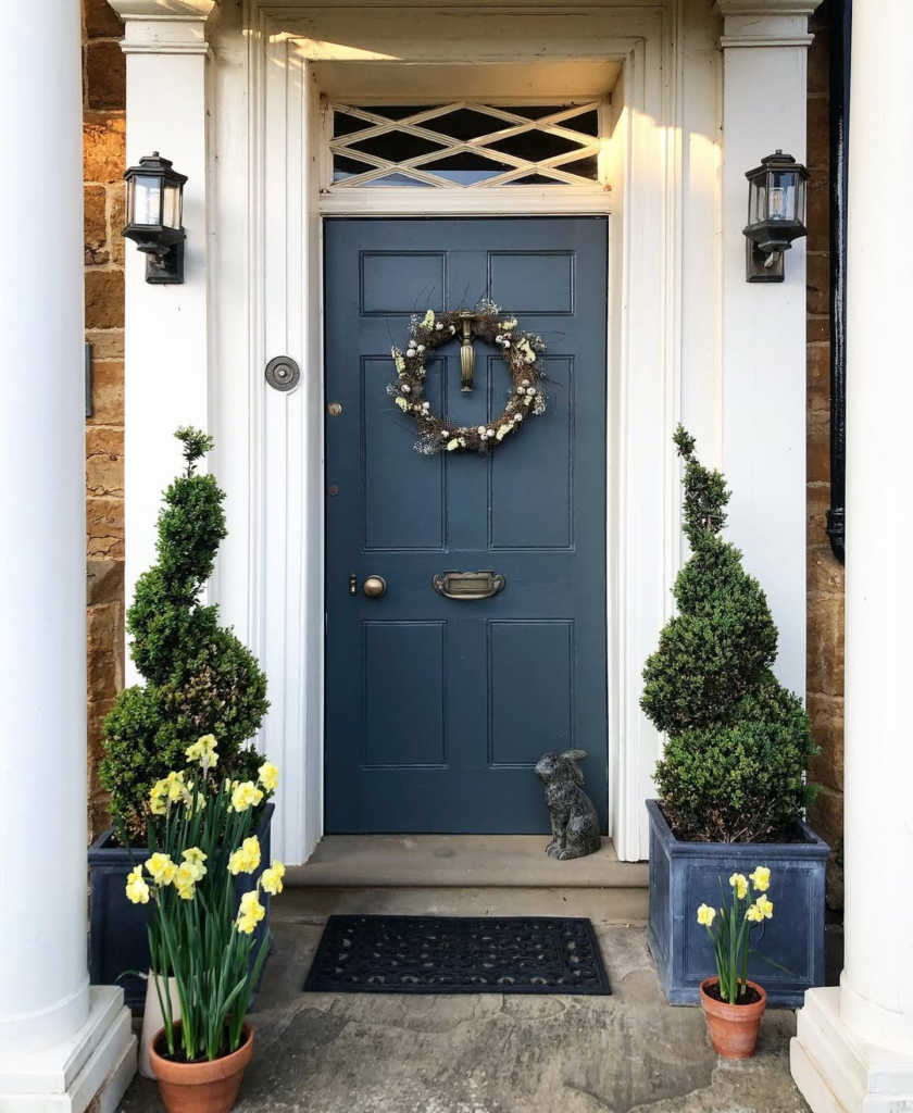 For those who prefer a softer touch, this grey-blue door paired with a woven Easter wreath achieves understated elegance. Symmetrical topiaries flank the entry, providing structure without overwhelming the design. The pastel ribbon and small floral accents hint at the season while maintaining calm and cohesion. This entryway whispers spring rather than shouting it, proving that subtlety can be just as compelling as maximalism.