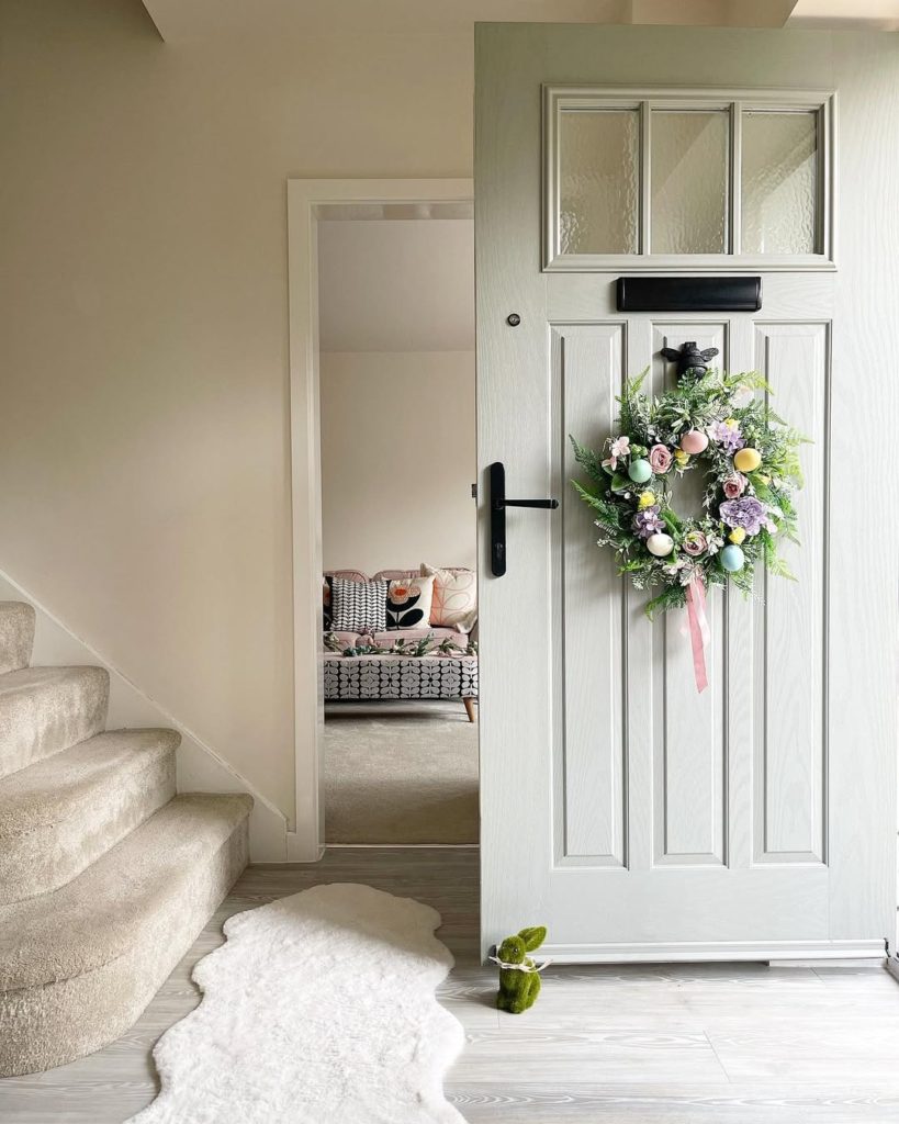 This entryway exudes warmth and charm, feeling lived-in and personal. Every bunny, egg, and floral element appears thoughtfully selected, creating a cozy, approachable scene. It’s the kind of design that encourages connection, making visitors feel welcomed into a home that’s both festive and genuinely comfortable.