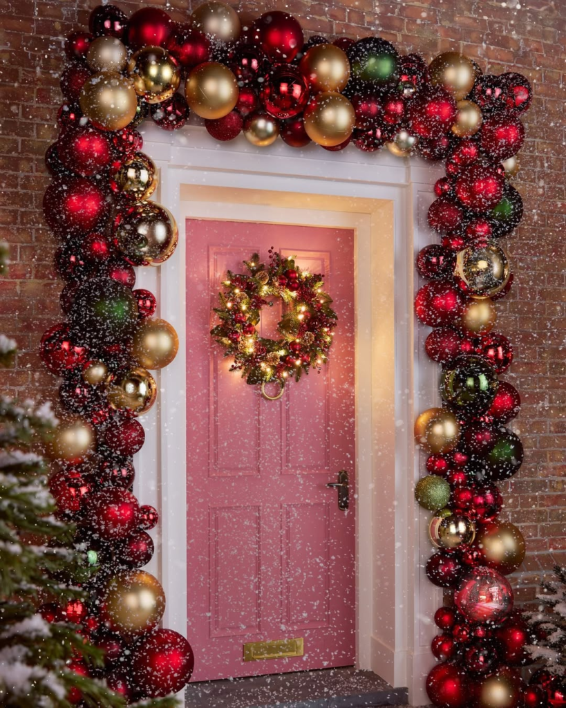 A pink front door serves as a bold focal point, elevated by an oversized metallic garland in deep reds, golds, and berry tones. Contrasting textures—from soft florals to shimmering baubles—create a fairytale-like spring scene with a glamorous twist. Unexpected and confident, this design blends holiday cheer with high style, showing that seasonal décor can be festive without losing sophistication.