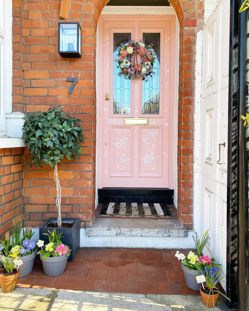 Soft pink doors paired with floral decals and spring planters create a gentle, storybook-inspired doorway. The composition feels curated but relaxed, with subtle feminine touches that enhance the charm without fuss. It’s the perfect introduction to spring mornings, radiating warmth, whimsy, and understated elegance.