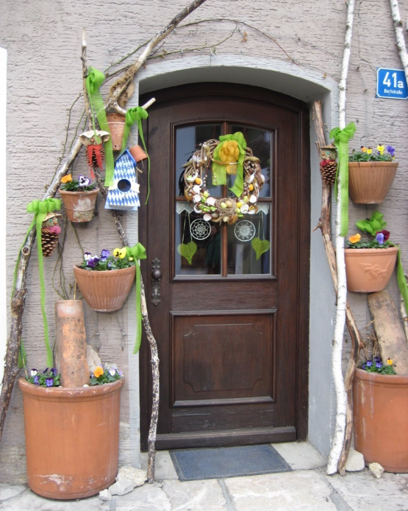 This doorway leans into raw textures and earthy tones. Birch branches, twine, and terra-cotta pots mix with fresh pansies and green ribbon to create a natural, organic scene. The wreath is abundant yet approachable, featuring twigs, feathers, and whimsical elements that suggest a connection to nature. This display celebrates the seasonal awakening in a way that feels wild, grounded, and refreshingly authentic.