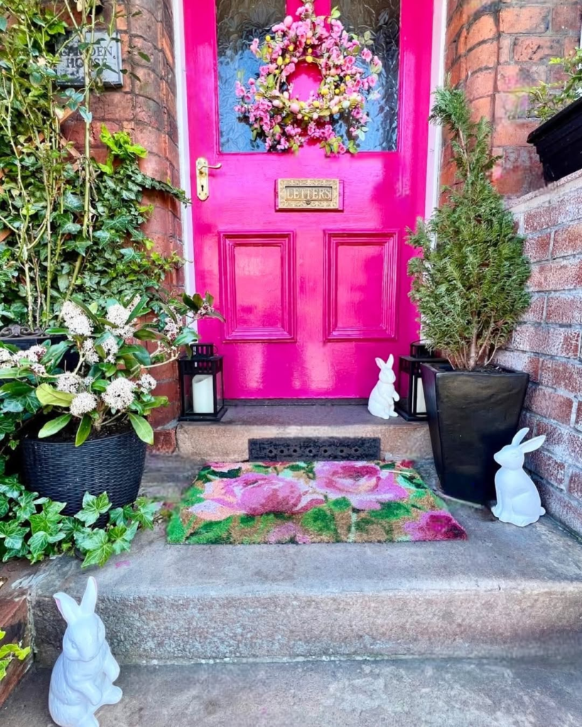 A hot pink door paired with candy-colored florals and glowing bunny accents creates a playful, high-energy entrance. A floral mat completes the scene with cheerful charm. The arrangement is exuberant without feeling chaotic, proving that Easter décor can be bold, fun, and memorable while still looking cohesive and intentional.
