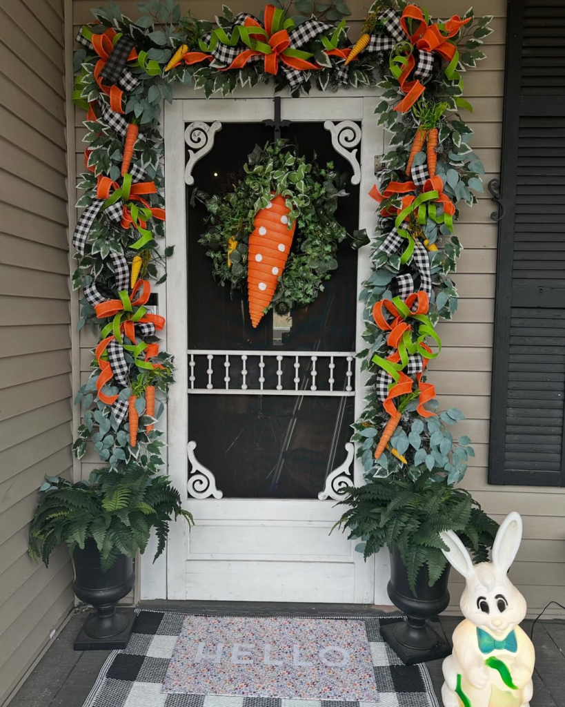 From gingham bows to oversized carrot accents, this Easter display evokes woodland fantasy. Vibrant greenery, vintage-style bunny lights, and playful color contrasts—orange, black-and-white, and lush greens—make the porch feel lively yet harmonious. It’s a modern take on country Easter charm with a mischievous twist, striking a balance between tradition and playful creativity.