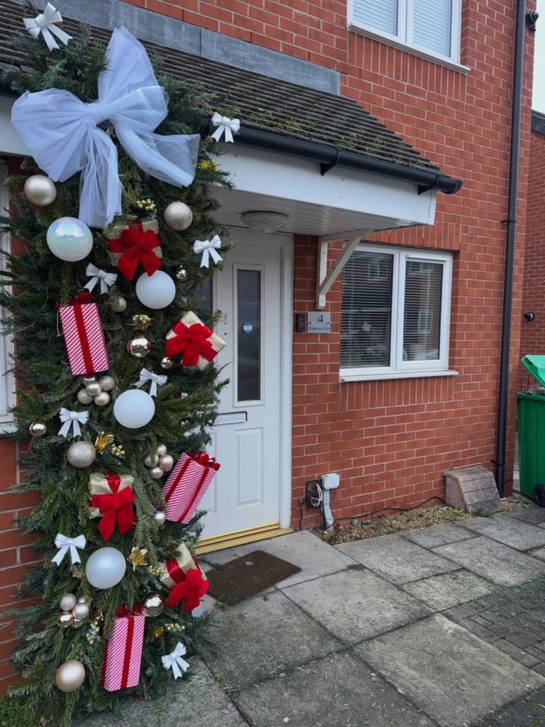A refined, classic approach shines through this doorway. Muted tones, restrained florals, and harmonious composition produce an elegant, enduring look. The display doesn’t scream for attention but still captivates, demonstrating that sophistication and tradition can coexist with seasonal cheer. This is a calm, polished, and understatedly festive entrance.