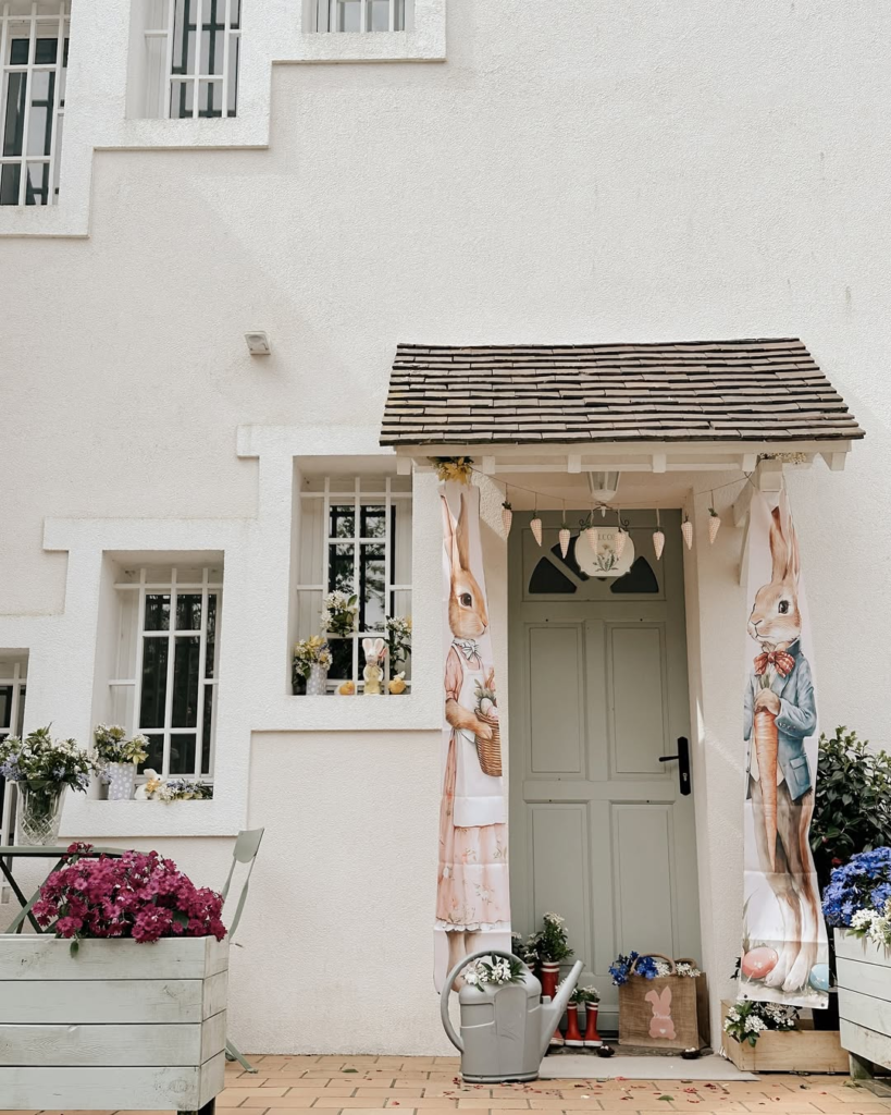Pastel doors, life-size bunny banners, and charming garden props evoke a storybook atmosphere. The layering of potted blooms, watering cans, and rustic accents creates a whimsical, heartwarming entryway. It’s a playful yet curated approach that feels personal and magical, bringing a fairytale-like charm to spring decorating.
