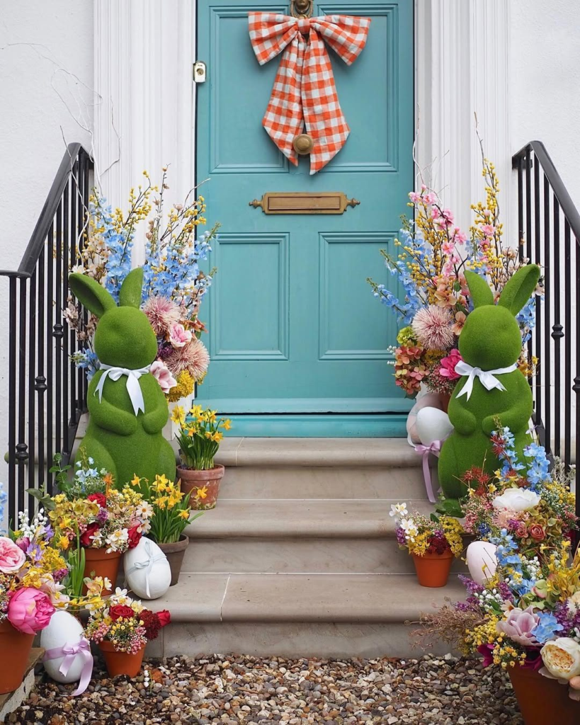 A coastal twist brings playful Easter charm to this doorway. Bunny figurines, crisp white siding, and rich wood tones create a clean, mature look while keeping the holiday spirit front and center. The setup is fun and lighthearted, but restrained enough to maintain sophistication. It’s proof that seasonal decorating can be playful without feeling childish.