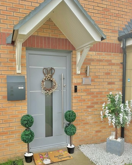 A modern, structured entryway combines symmetry, soft seasonal accents, and playful details like bunny-eared wreaths and welcome mats. The grey door provides a clean backdrop while topiaries and subtle floral touches keep the look festive yet refined. It’s cheerful, approachable, and effortlessly stylish—a perfect example of understated spring charm.