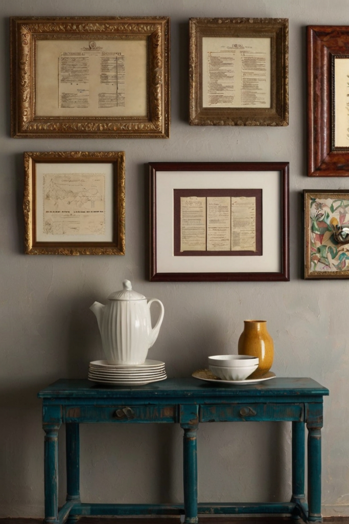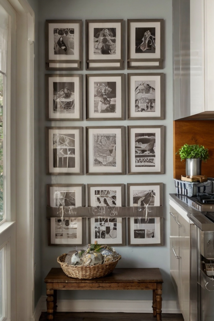 A gallery wall is a simple way to bring personality and charm into the kitchen. You can mix framed artwork, family photos, or decorative plates to create a display that feels curated and meaningful.
