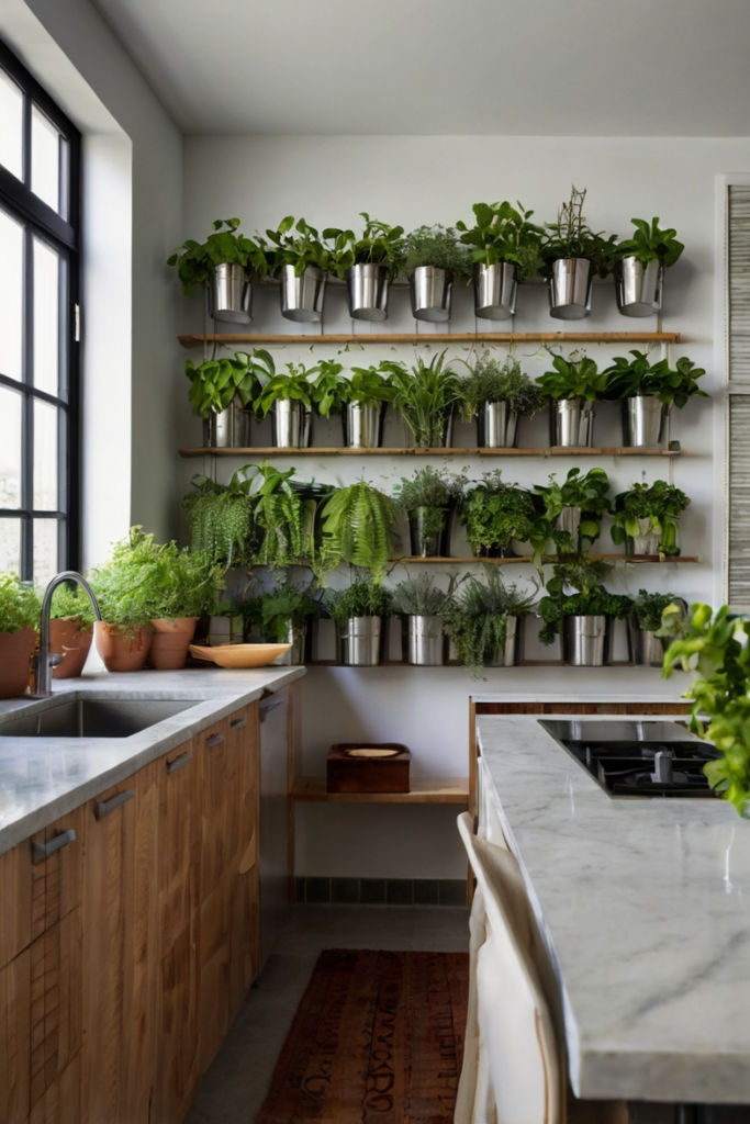 Ensure the plants receive enough light and are easy to water. Small planters suit compact kitchens, while larger vertical gardens make a striking statement on bigger walls.