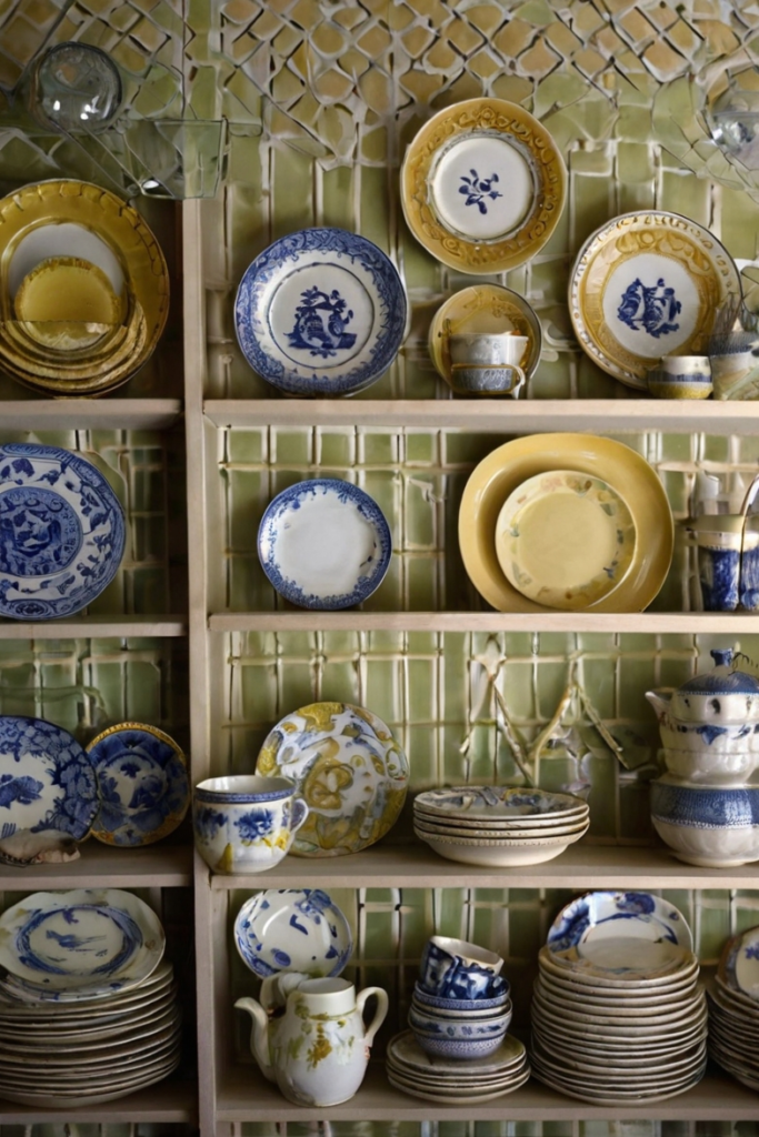 This approach adds color, pattern, and texture, making it ideal for traditional, cottage, or eclectic kitchen styles. It’s also budget-friendly, as unique plates are often found at thrift shops or inherited.