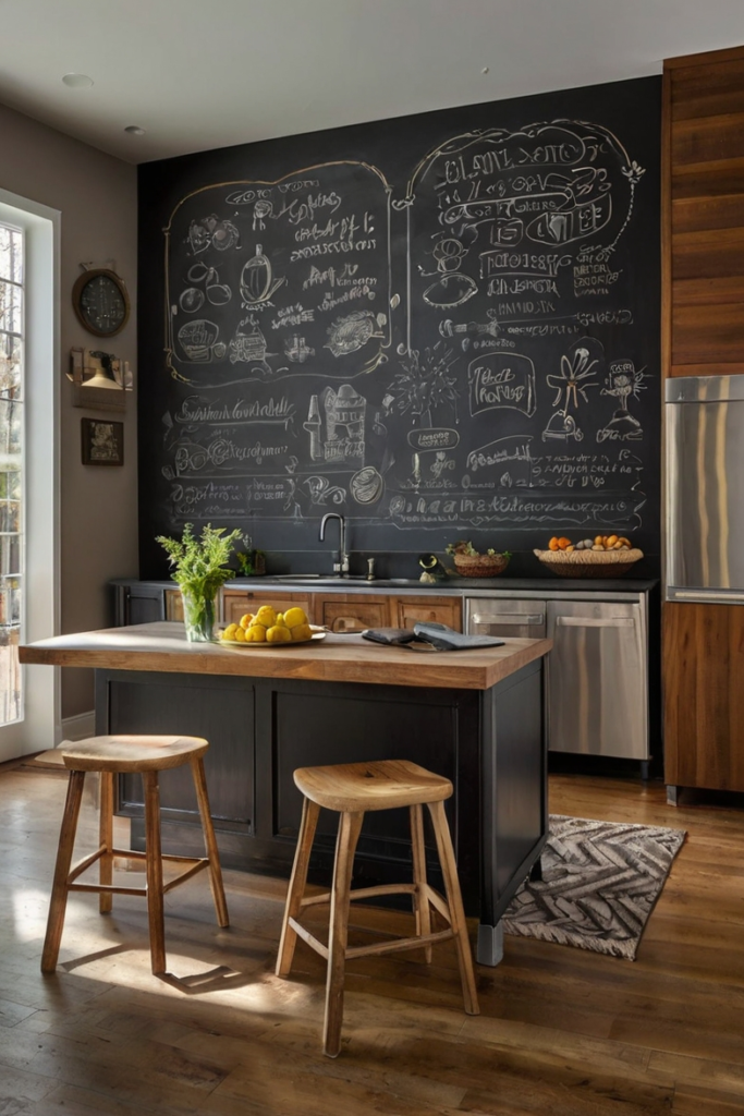 A chalkboard wall adds a playful, interactive element that makes the kitchen feel lively and engaging.