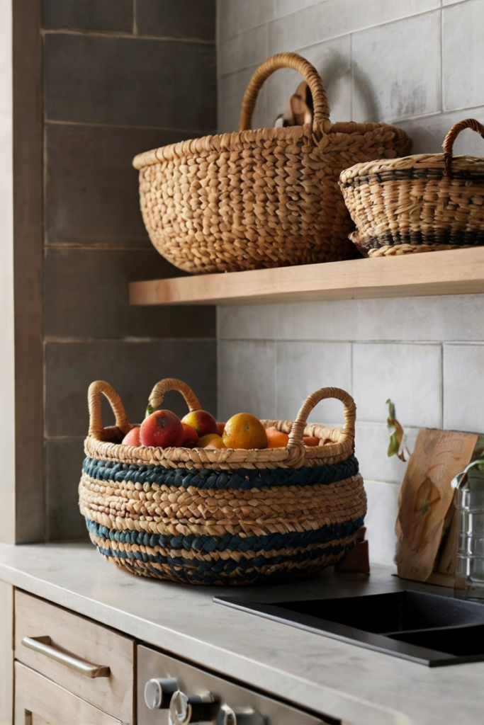 Woven baskets add texture, warmth, and natural beauty to kitchen walls. They can be displayed purely decoratively or used to store items like produce or linens.