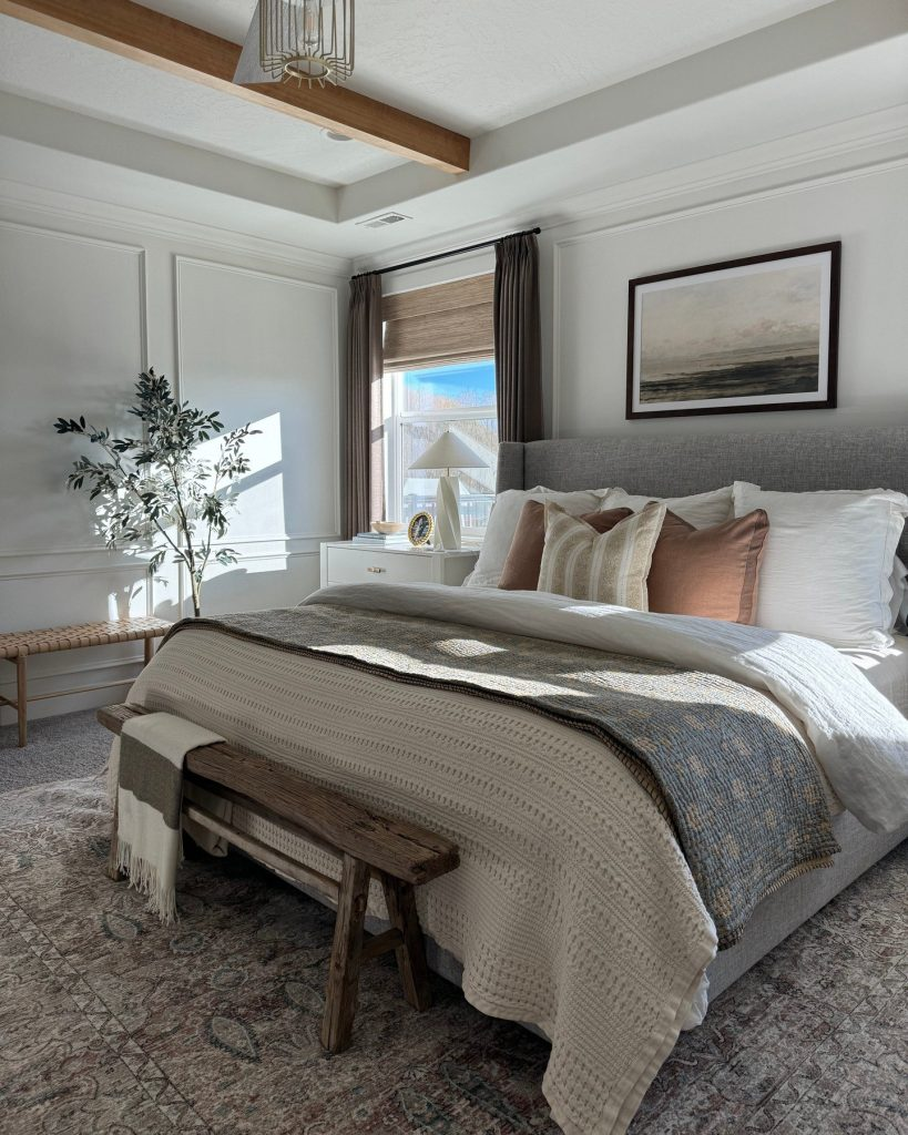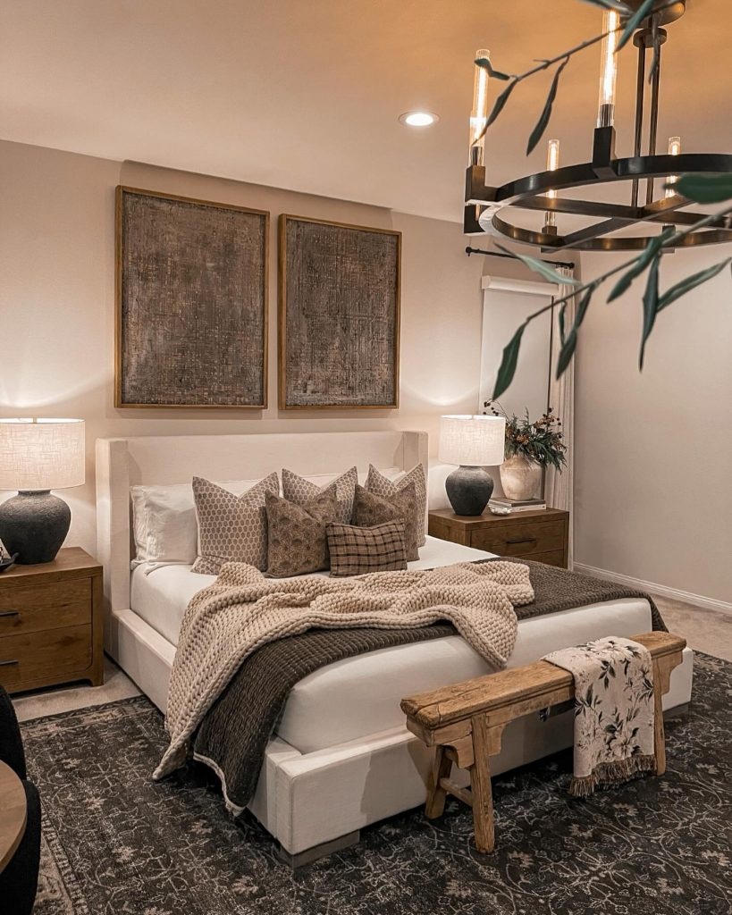 Imagine a bedroom radiating serenity and grace. Neutral colors form the foundation, creating a sophisticated canvas that allows for a play of textures to add warmth and depth. Pairing crisp white bedding with the cozy texture of a chunky knit throw strikes a perfect balance between comfort and style. Earthy wood elements, such as the sturdy bedside tables and a rustic bench at the foot of the bed, ground the space, while abstract art pieces introduce a touch of intellectual sophistication. This design epitomizes a refined masculine aesthetic for the man who values minimalism and art.