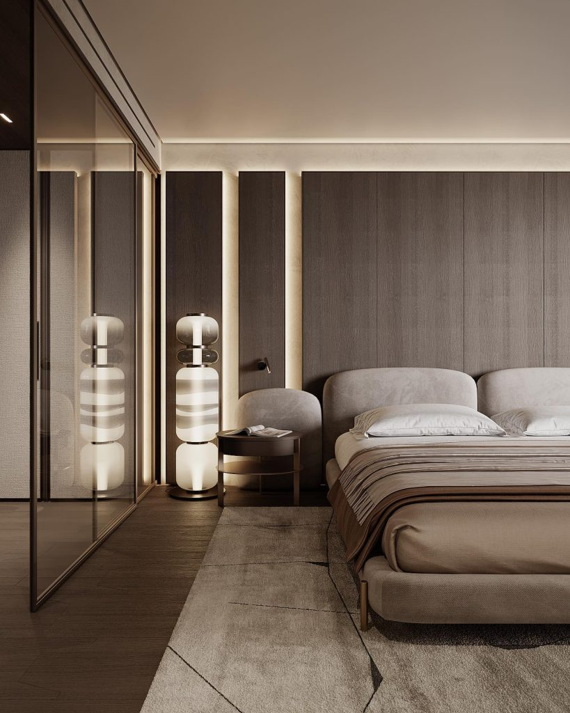 A bedroom that exudes contemporary zen features clean lines and uncluttered space. Vertical light panels add a tranquil ambiance, perfect for those seeking serenity amidst a busy life. This design provides a minimalist sanctuary for reflection and recharge, reflecting modern living with a focus on simplicity.