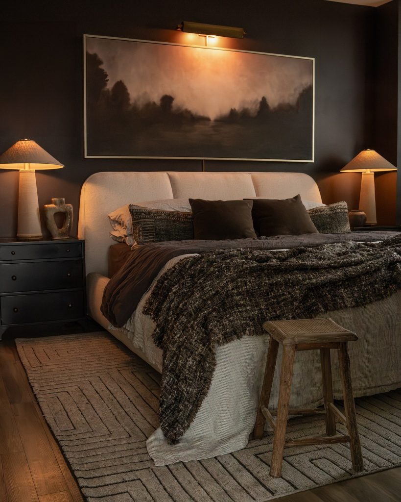 An imaginative mural turns this bedroom into a personal gallery, where art and life intersect. Earthy tones and plush textures ensure comfort is not sacrificed for style. This space is perfect for the man whose home reflects his creative spirit, serving as both a conversation starter and a personal haven.