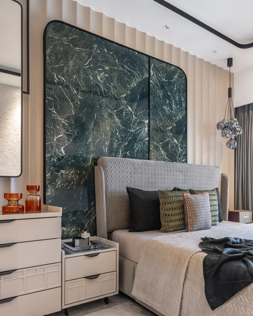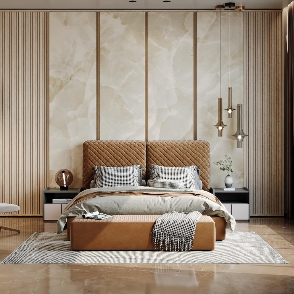 A bedroom featuring a statement headboard in lush marble sets a tone of opulence and stability. The rich texture of marble contrasts with the softness of the bedding, creating a sensory experience that is both grounding and uplifting. This design is perfect for the man whose appreciation for natural beauty and luxurious details reflects a life well-lived.