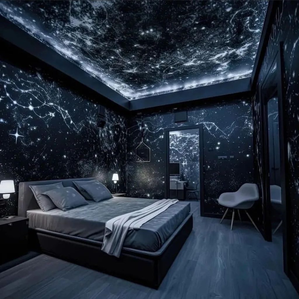 For the dreamer, a bedroom transformed into a cosmic voyage creates an otherworldly experience. The stellar ceiling and walls envelop the space in a celestial aura, turning sleep into exploration. This room is a perfect backdrop for a man fascinated by the universe and its mysteries, offering a space where imagination knows no bounds.