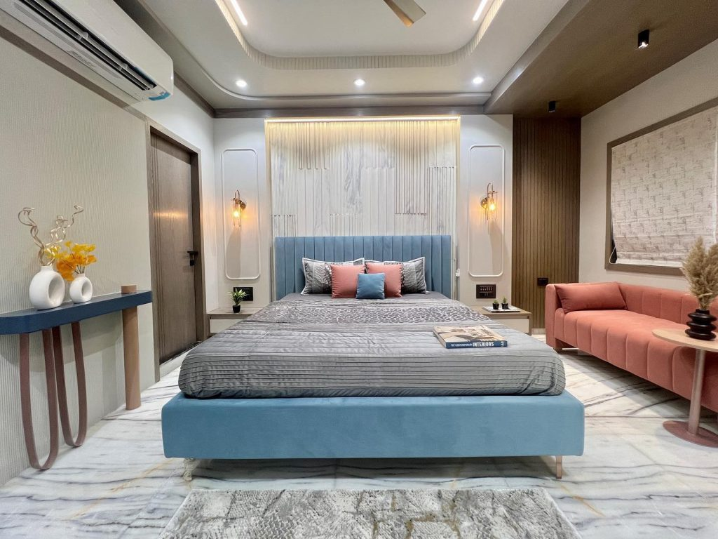 Envision a bedroom where contemporary art intersects with modern design. A sleek platform bed anchors the space, while abstract artwork above introduces a splash of color that complements the textiles. Drop pendant lights add vertical dimension, enhancing the clean lines of the furniture. This room celebrates minimalist design with a warm, inviting touch, catering to those who appreciate both simplicity and sophistication.