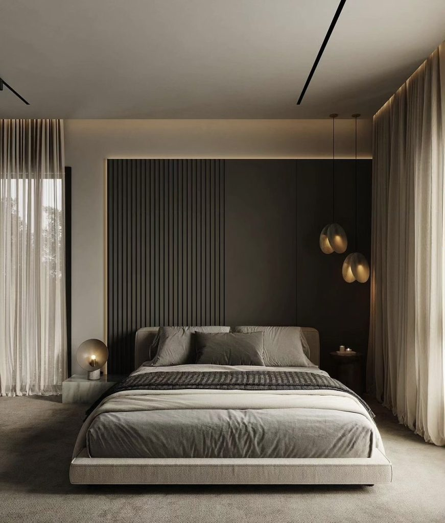 This bedroom’s blend of soft textiles and sleek lines creates a haven of tranquil elegance. The subtle tones and natural light filtering through sheer curtains foster a serene ambiance. This design caters to men who value understated sophistication and simplicity, offering a minimalist space that is both stylish and functional.