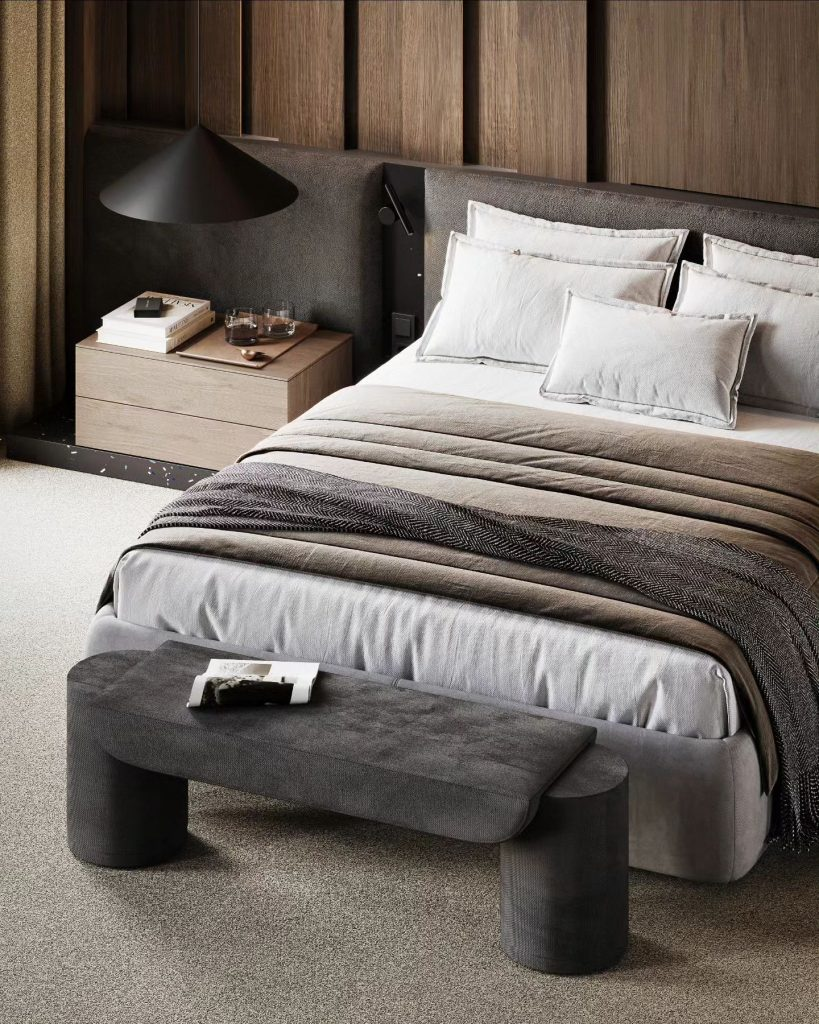 In a space where geometric shapes meet luxury, a bed surrounded by oversized cushions invites relaxation. Angled wooden panels on the wall showcase modern craftsmanship, while accent lighting casts a warm, comforting glow. This room is a sanctuary for men who desire a masculine yet inviting environment, with grey tones and plush textures offering understated elegance.