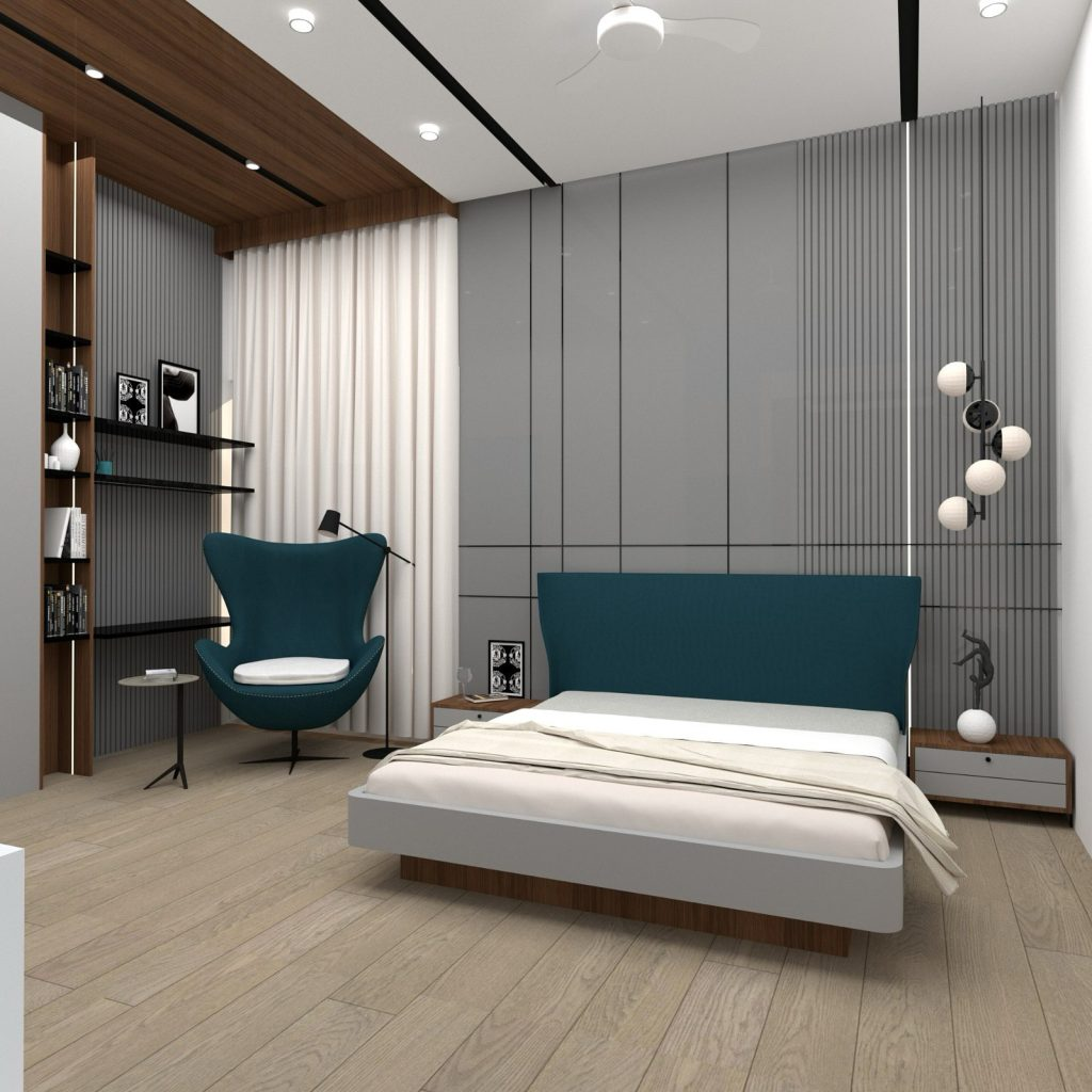 Bold and lively, this bedroom features a striking blue headboard that contrasts with grey and white hues. The simplicity of the Ikea-style furniture and modern lighting fixtures create a stylish and functional space. Ideal for small rooms, the design balances expansiveness with intimacy, making it a vibrant retreat for energetic individuals.