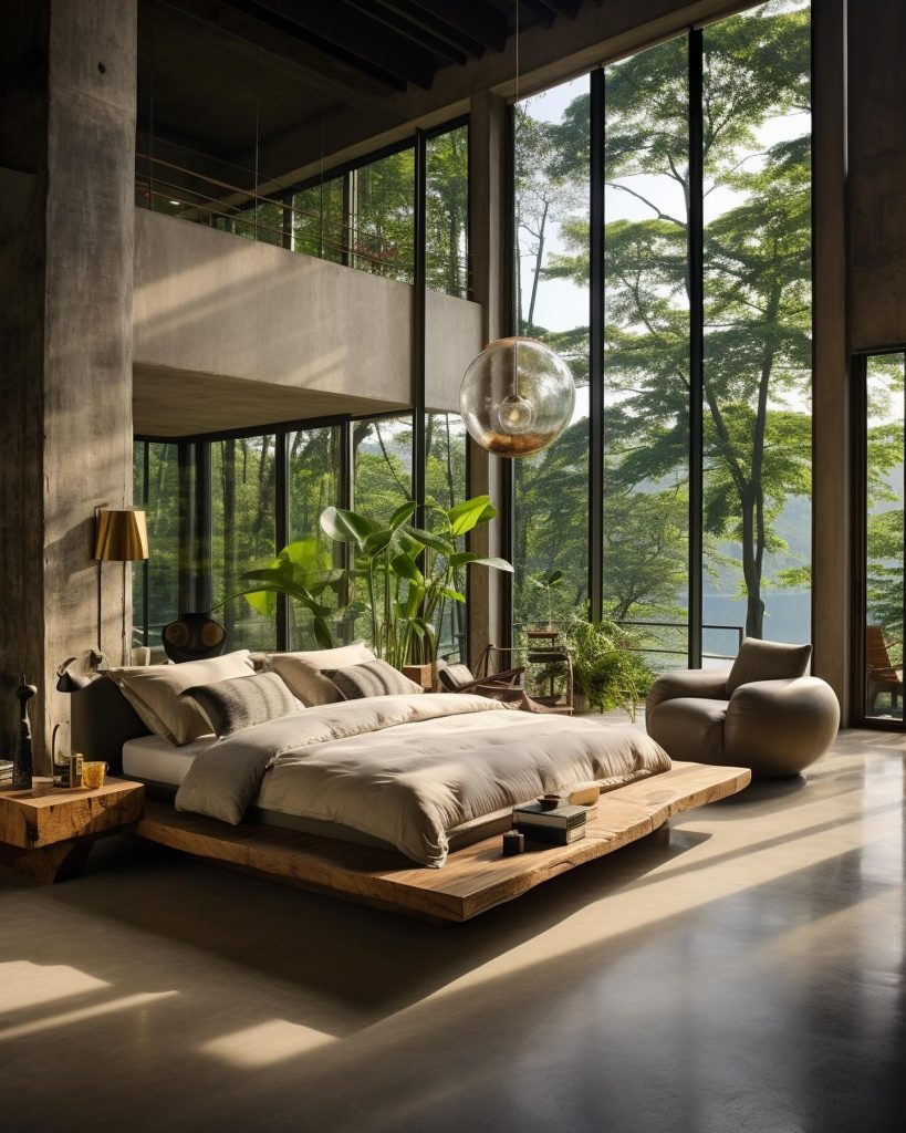 This bedroom seamlessly integrates nature with indoor living through robust wooden elements and floor-to-ceiling windows. The cool tranquility of the forest is brought inside, creating a perfect setting inspired by earthy tones. This design offers a sanctuary that blends natural beauty with personal comfort.