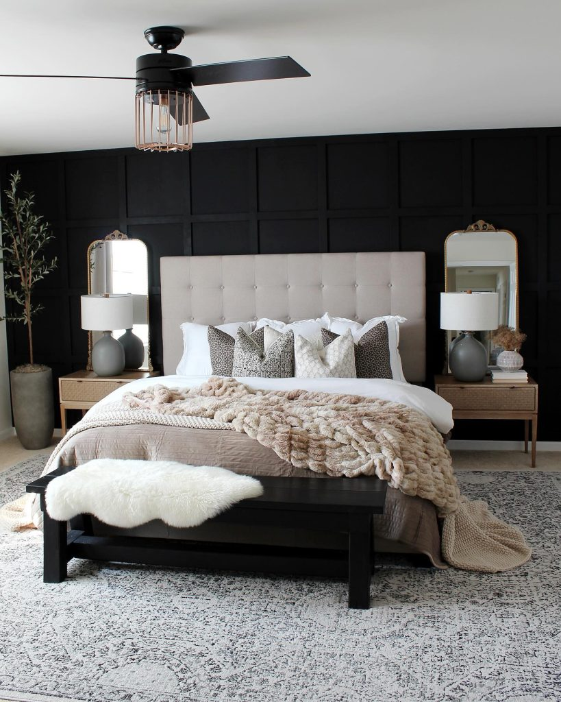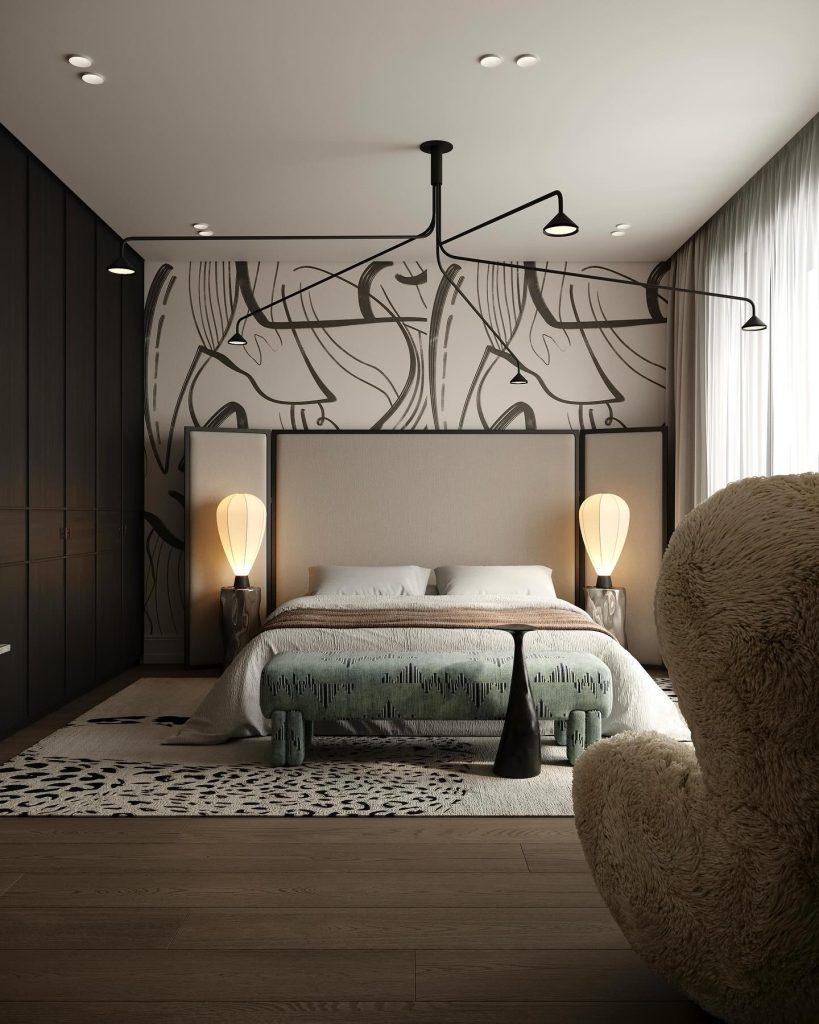 Featuring a striking combination of black and white walls, this bedroom makes a bold statement. A spider-like light fixture and textured bedding add sophistication, creating a contemporary and comforting space. This design achieves a mature and refined aesthetic, ideal for a sophisticated guy room.