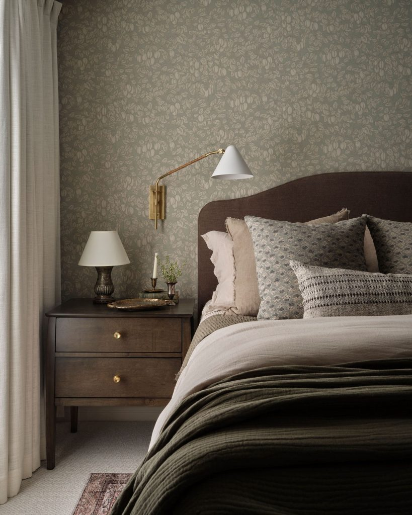 This bedroom combines texture and pattern to create a cozy retreat that blends rustic and modern elements. Intricate wallpaper and layered bedding reflect a man’s attention to detail and comfort, making it an ideal setting for those who seek a balance of rugged charm and sleek design.