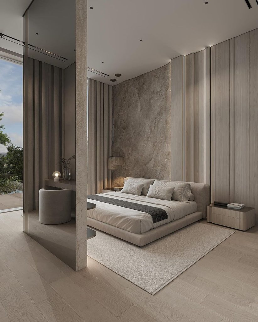 This bedroom embraces the raw beauty of concrete, complemented by warm wooden flooring. Ambient lighting gently highlights the textures, creating a striking yet subdued play of light. Ideal for the man who appreciates modern, timeless aesthetics, this space uses grey and rich brown hues to echo the natural world, providing a balance of aesthetic restraint and comfort.