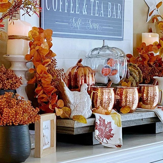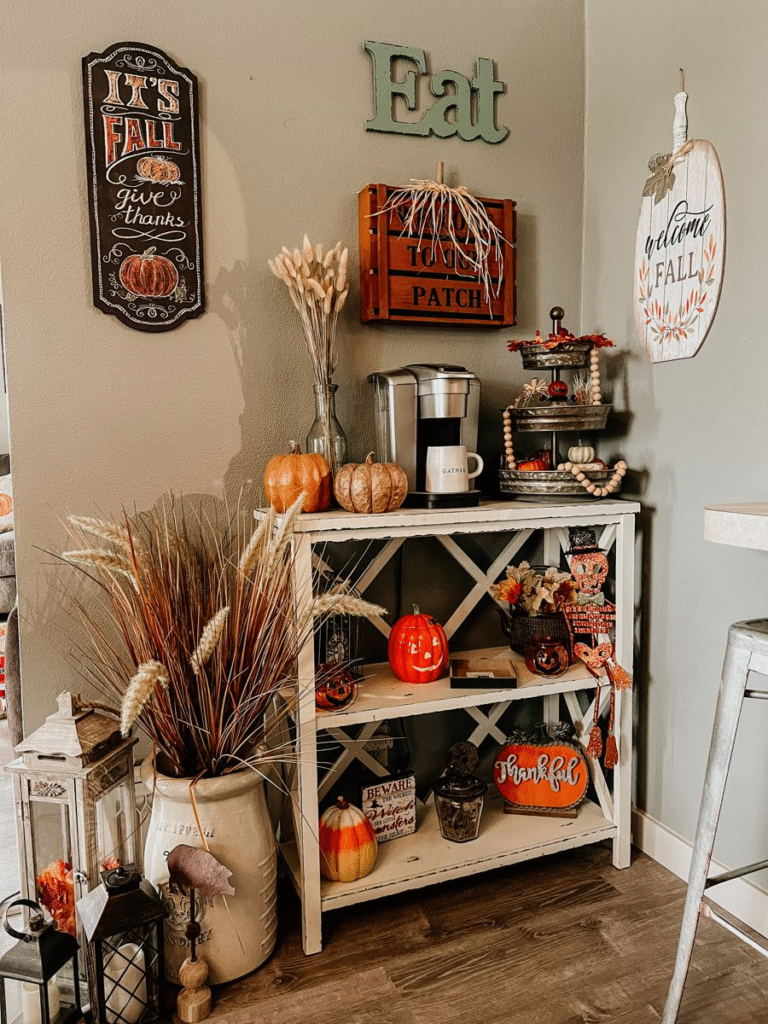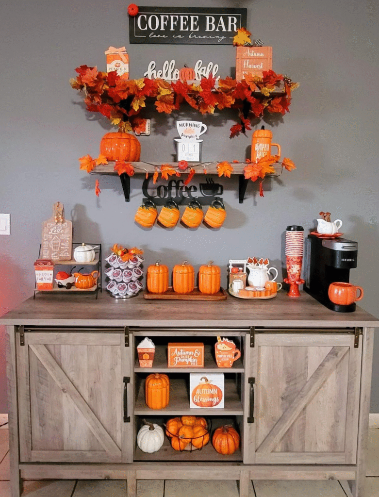 A charming coffee bar sets the tone for your seasonal décor. Focus on warm colors, cozy accents, and a welcoming layout that makes your morning routine feel extra special. Adding small fall touches like pumpkins, candles, or rustic mugs can instantly elevate the space.