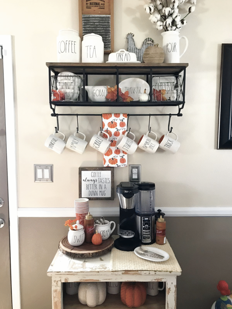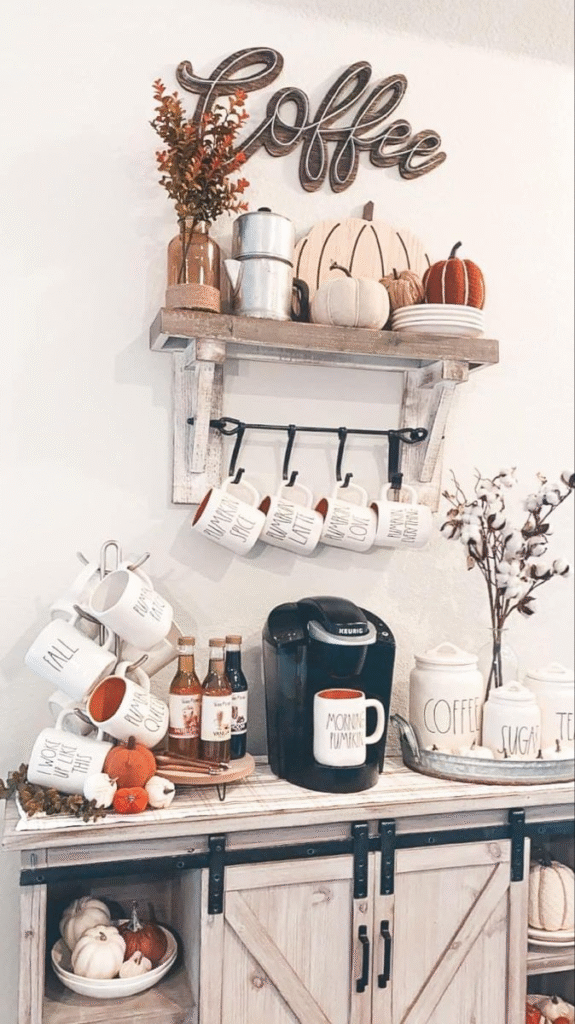 For a cozy farmhouse feel, try a rustic coffee bar. Use natural wood textures, galvanized metal trays, or vintage jars for storing coffee essentials. Pair it with autumn décor like dried leaves or pinecones to complete the look.