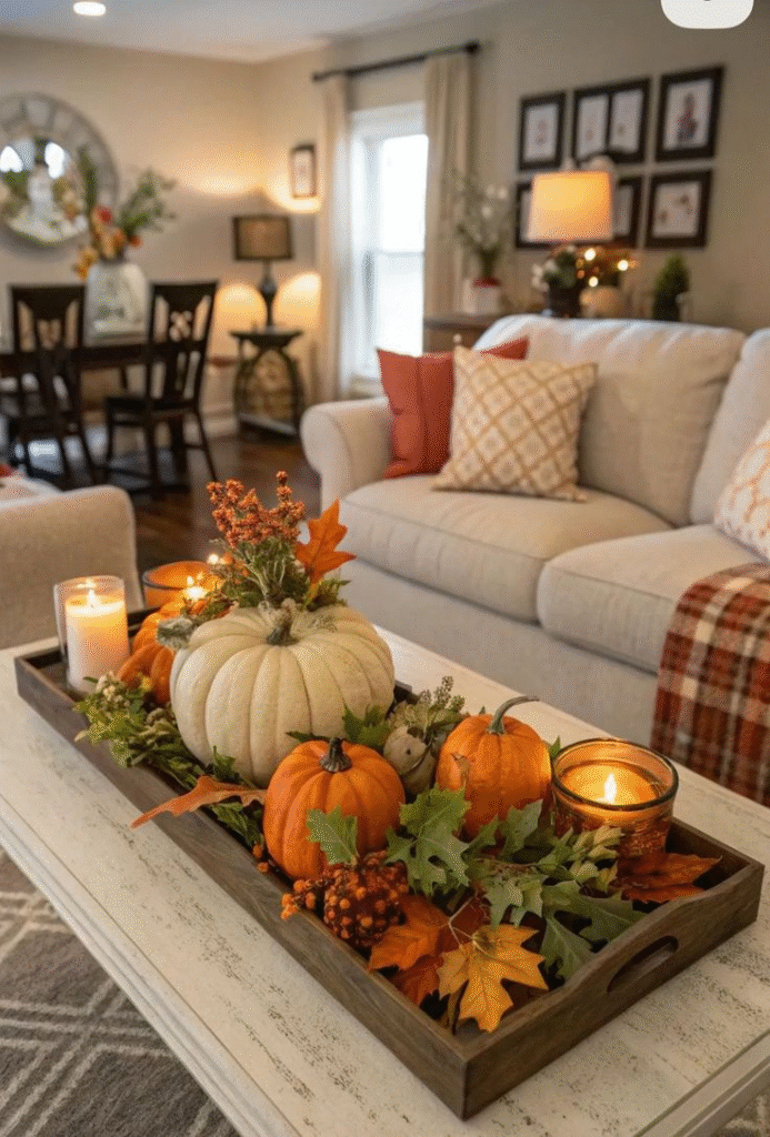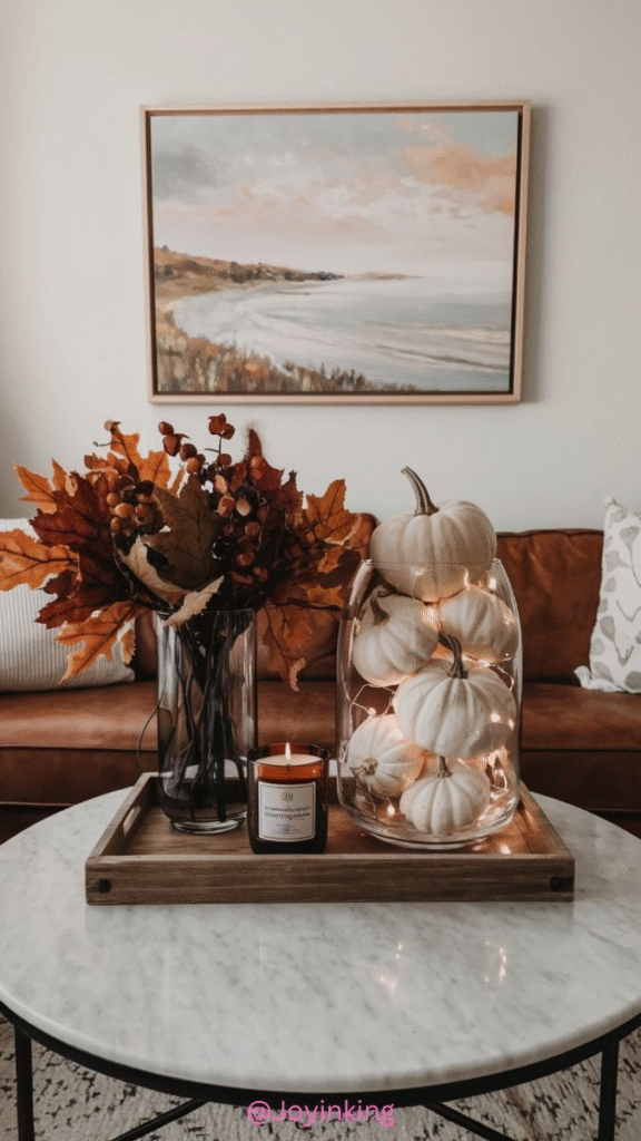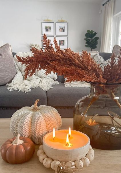 Nothing says fall like cozy accents. Soft throws, small lanterns, and autumn-inspired candles can transform your coffee table into a comforting focal point. This style is perfect for creating that snug seasonal vibe.