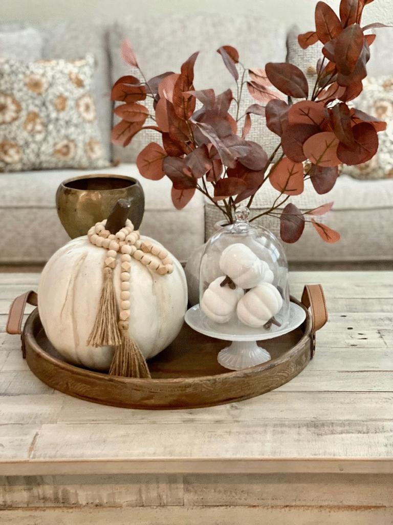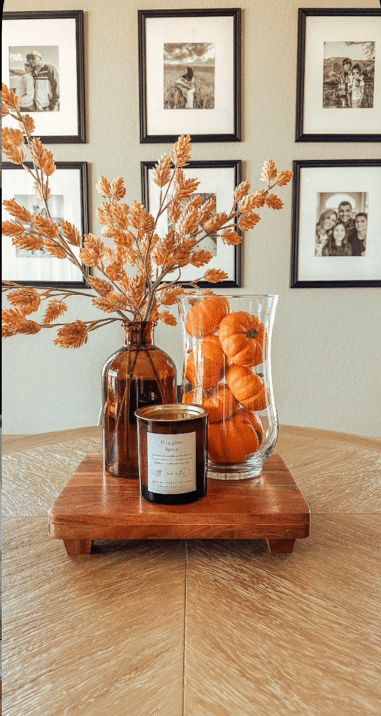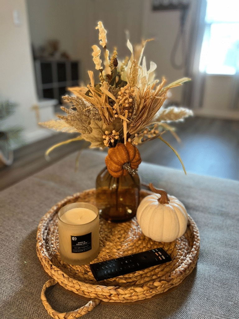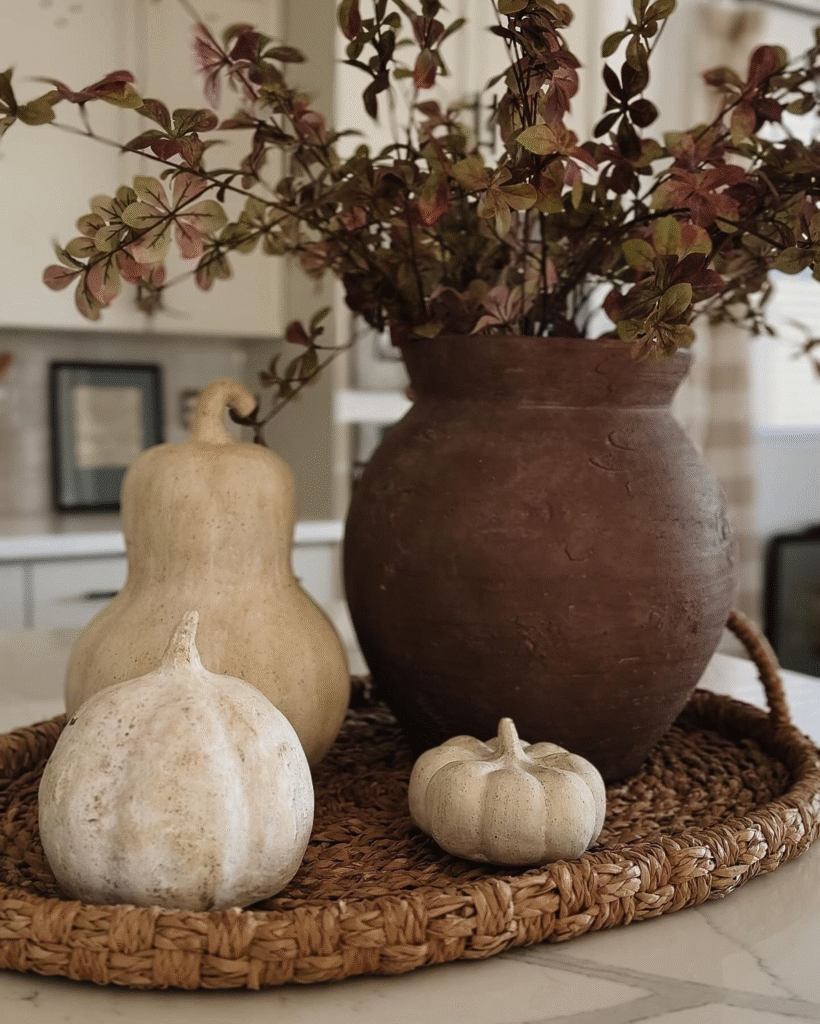 If you prefer light and fresh styling, go with airy décor. Use neutral tones, open trays, and minimal seasonal accents to create a spacious feel while still honoring the fall aesthetic.