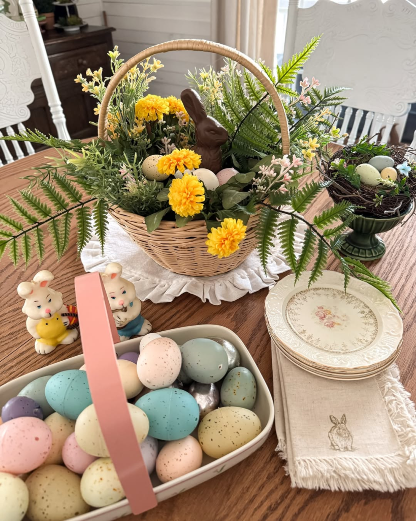 This tablescape exudes the comforting charm of a traditional Easter brunch with a modern farmhouse twist. A wicker basket brimming with marigolds, ferns, and a chocolate bunny creates the perfect centerpiece, surrounded by pastel speckled eggs and vintage-style rabbit figurines. It evokes memories of childhood holidays while remaining chic and Pinterest-ready.