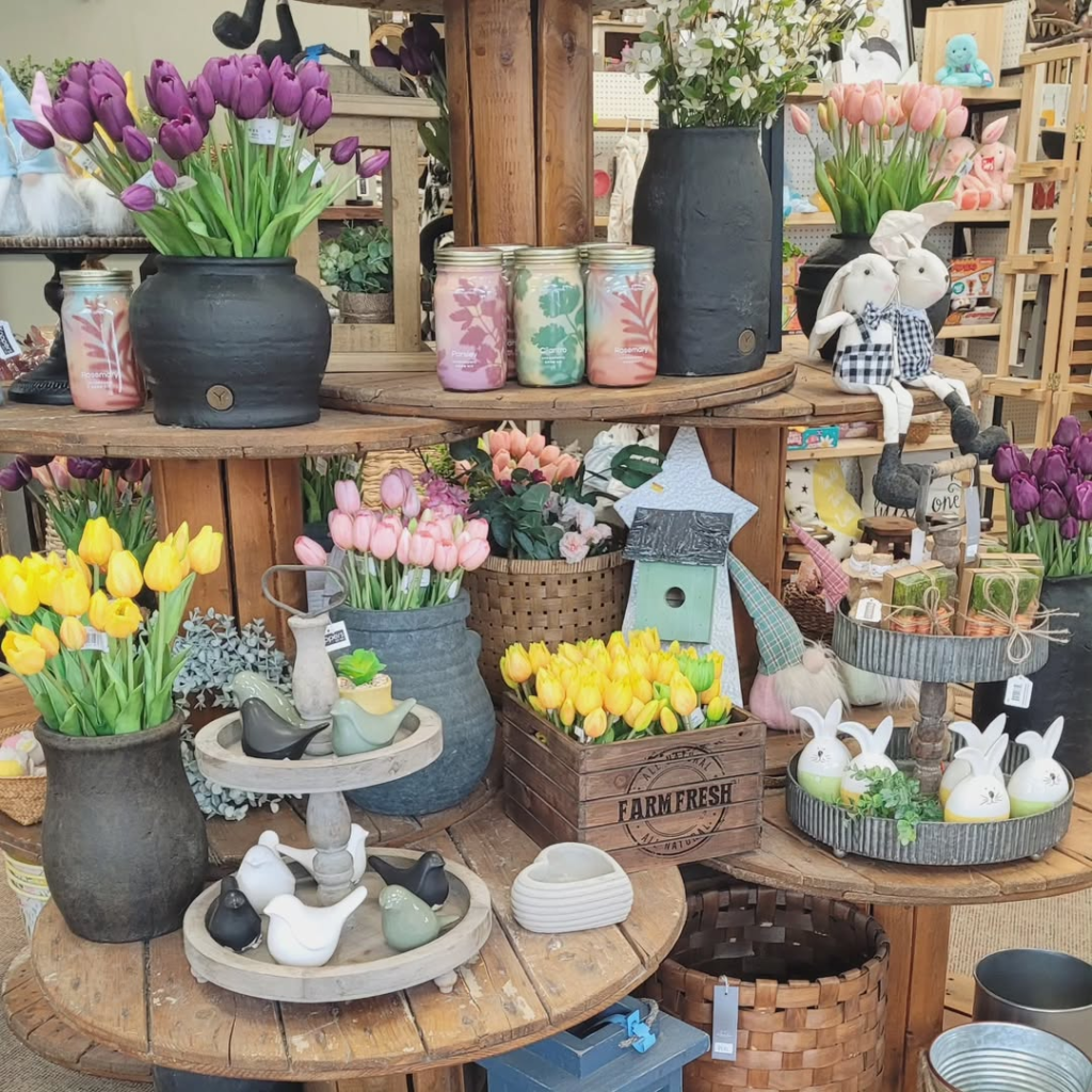 Walking into this display is like stepping into a vibrant spring market. Bursting tulips in shades of deep purple, sunny yellow, and soft pink bring energy, while wooden crates and tiered shelves anchor the scene in rustic farmhouse style. The mix of textures—from fabric bunnies to ceramic birds and mason jar candles—adds playful interest at every turn.